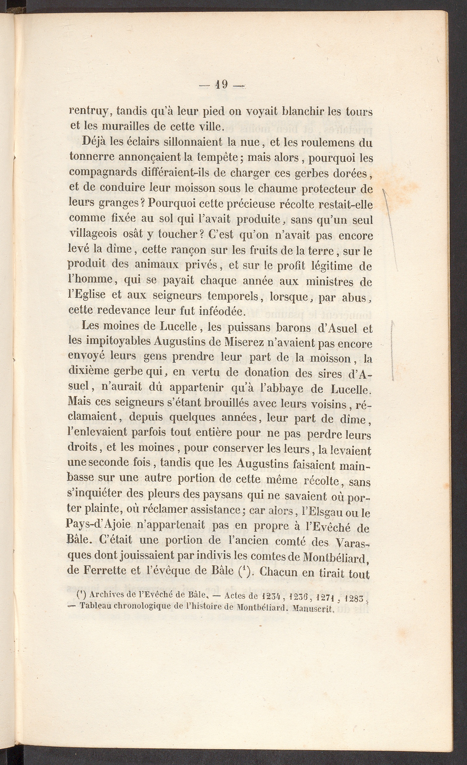 Les moines de Lucelle , les puissans barons d’Àsuel etles impitoyables Augustins de Miserez n’avaient pas encoreenvoyé leurs gens prendre leur part de la moisson, ladixième gerbe qui, en vertu de donation des sires d’A-suel, n’aurait dû appartenir qu’à l’abbaye de Lucelle .Mais ces seigneurs s’étant brouillés avec leurs voisins, ré-clamaient, depuis quelques années, leur part de dîme,l’enlevaient parfois tout entière pour ne pas perdre leursdroits, et les moines , pour conserver les leurs, la levaientune seconde fois, tandis que les Augustins faisaient main-basse sur une autre portion de cette même récolte, sanss’inquiéter des pleurs des paysans qui ne savaient où por-ter plainte, où réclamer assistance; car alors, l’Elsgau ou lePays-d’Ajoie n’appartenait pas en propre à l’Evêché deBâle . C’était une portion de l’ancien comté des Varas-ques dont jouissaient par indivis les comtes de Montbéliard ,de Ferrette et l’évêque de Bâle ( 4 ). Chacun en tirait tout
