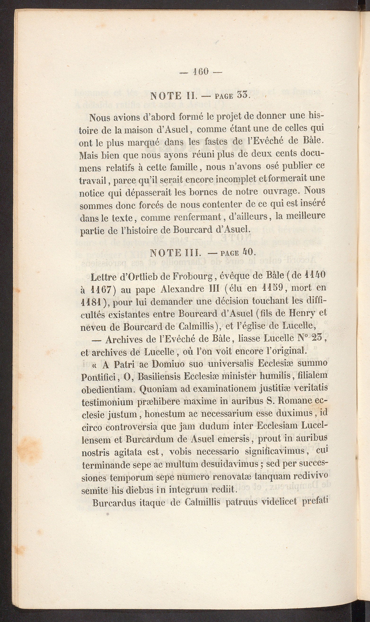 Lettre d’Ortlieb de Frobourg, évêque de Bâle (de 1140à 1167) au pape Alexandre III (élu en 1159, mort en1181), pour lui demander une décision touchant les diffi-cultés existantes entre Bourcard d’Asuel (fds de Henry etneveu de Bourcard de Calmillis), et l’église de Lucelle,