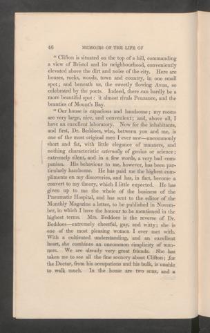 u Our house is capacious and handsome; my roomsare very large, nice, and convenient; and, above all, Ihave an excellent laboratory. Now for the inhabitants,and first, Dr. Beddoes , who, between you and me, isone of the most original men I ever saw—uncommonlyshort and fat, with little elegance of manners, andnothing characteristic externally of genius or science;extremely silent, and in a few words, a very bad com-panion. His behaviour to me, however, has been par-ticularly handsome. He has paid me the highest com-pliments on my discoveries, and has, in fact, become aconvert to my theory, which I little expected. He hasgiven up to me the whole of the business of thePneumatic Hospital, and has sent to the editor of theMonthly Magazine a letter, to be published in Novem-ber, in which I have the honour to be mentioned in thehighest terms. Mrs. Beddoes is the reverse of Dr. Beddoes —extremely cheerful, gay, and witty; she isone of the most pleasing women I ever met with.With a cultivated understanding, and an excellentheart, she combines an uncommon simplicity of man-ners. We are already very great friends. She hastaken me to see all the fine scenery about Clifton; /orthe Doctor, from his occupations and his bulk, is unableto walk much. In the house are two sons, and a