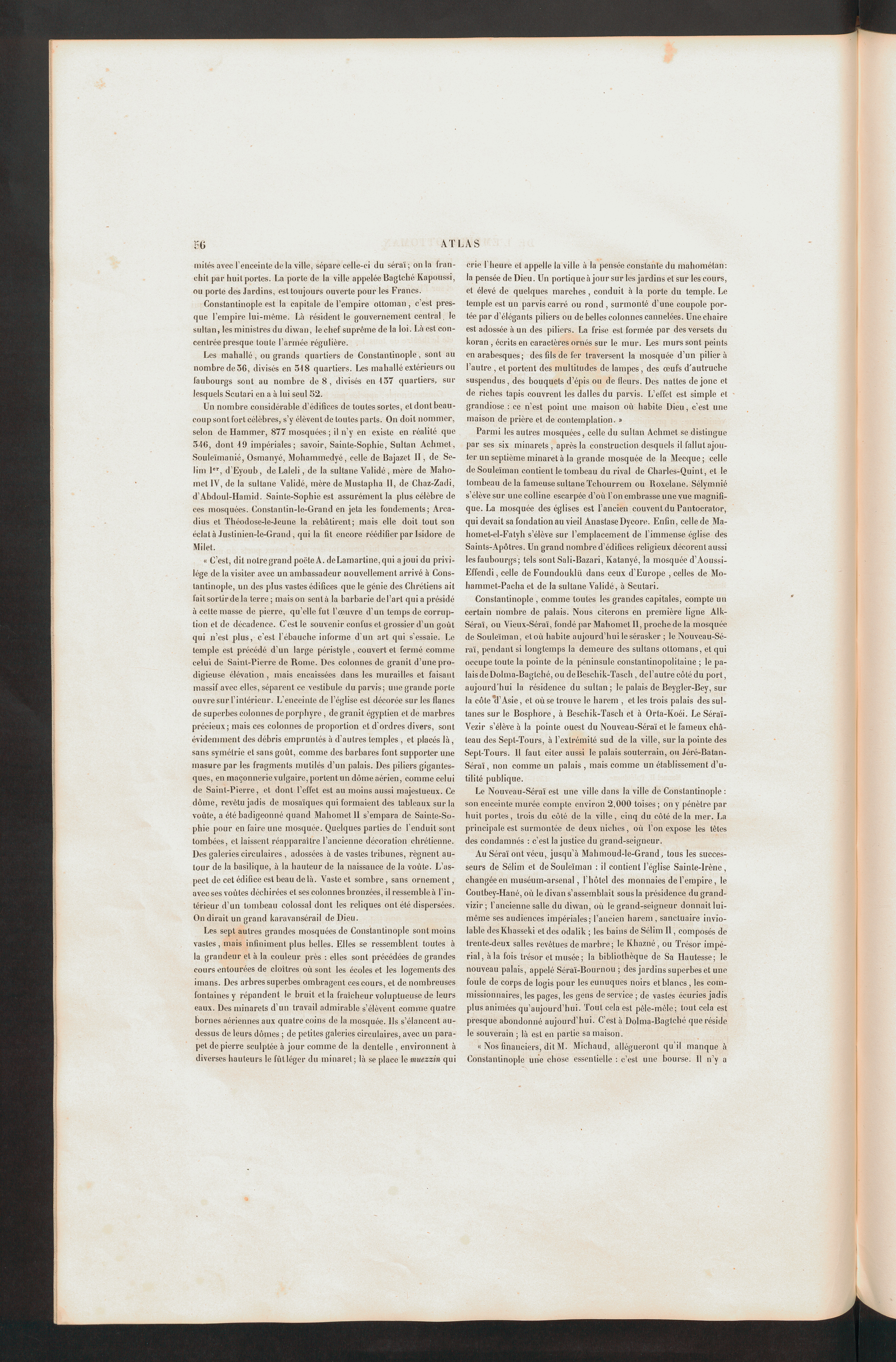 Un nombre considérable d’édifices de toutes sortes, et dont beau-coup sont fort célèbres, s’y élèvent de toutes parts. On doit nommer,selon de Hammer, 877 mosquées ; il n’y en existe en réalité que546, dont 4 9 impériales; savoir, Sainte-Sophie , Sultan Achmet,Souleïmanié, Osmanyé, Mohammedyé, celle de Bajazet II , de Se-lim 1 er , d’Eyoub, de Laleli, de la sultane Validé , mère de Maho-met IV, de la sultane Validé, mère de Mustapha II, de Chaz-Zadi,d’Abdoul-Hamid. Sainte-Sophie est assurément la plus célèbre deces mosquées. Constanlin-le-Grand en jeta les fondements; Arca-dius et Théodose-le-Jeune la rebâtirent; mais elle doit tout sonéclat à Juslinien-le-Grand , qui la fit encore réédifier par Isidore de Milet .