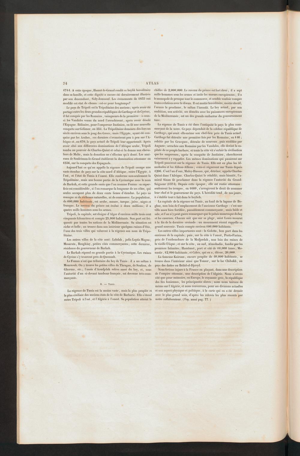 La régence de Tunis est la moins vaste , mais la plus peuplée etla plus civilisée des anciens états de la côte de Barbarie. Elle s’étendentre Tripoli à l’est, et l’Algérie à l’ouest. Sa population atteint le