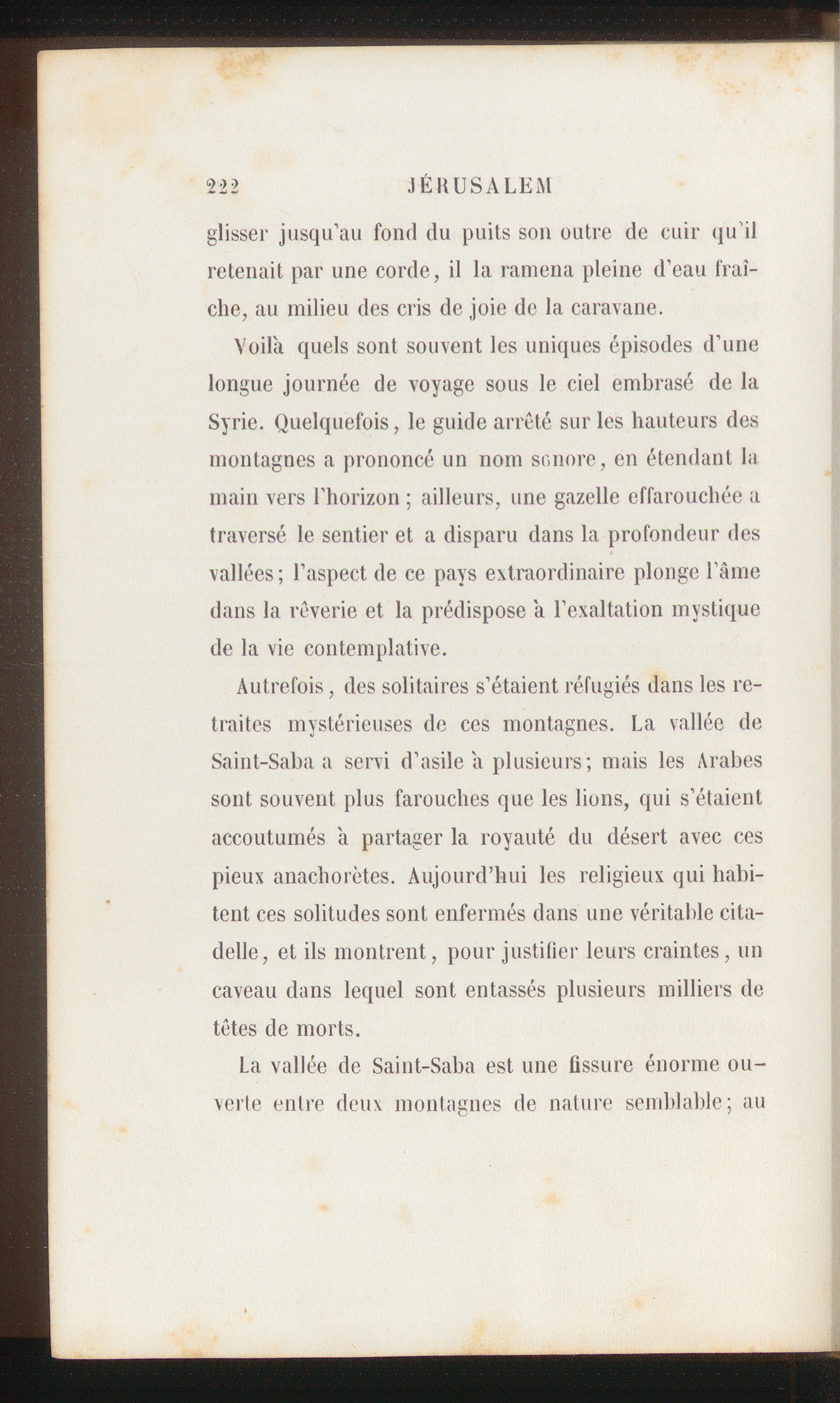 Voila quels sont souvent les uniques épisodes d’unelongue journée de voyage sous le ciel embrasé de laSyrie . Quelquefois, le guide arrêté sur les hauteurs desmontagnes a prononcé un nom snnorc, en étendant lamain vers l’horizon ; ailleurs, une gazelle effarouchée atraversé le sentier et a disparu dans la profondeur desvallées; l’aspect de ce pays extraordinaire plonge l’âinedans la rêverie et la prédispose a l’exaltation mystiquede la vie contemplative.