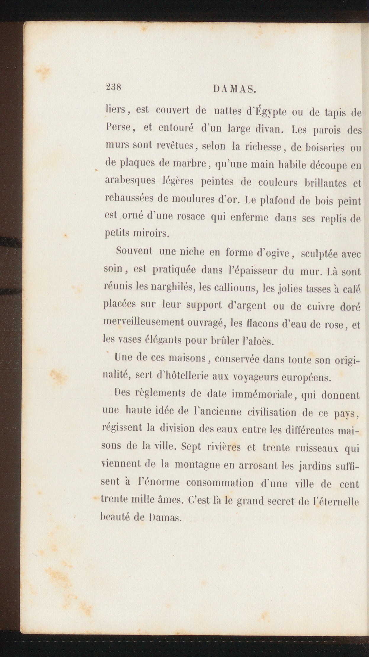 Des règlements de date immémoriale, qui donnentune haute idée de l’ancienne civilisation de ce pays,régissent la division des eaux entre les différentes mai-sons de la ville. Sept rivières et trente ruisseaux quiviennent de la montagne en arrosant les jardins suffi-sent à l’énorme consommation d’une ville de centtrente mille âmes. C’est la le grand secret de l'éternellebeauté de Damas.