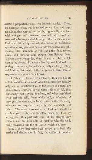 .relative proportions, and form different oxides. Thus,for example, when lead is melted over a fire and keptfor a long time exposed to the air, it gradually combineswith oxygen, and becomes converted into a yellow-coloured substance, called litharge ; this is an oxide oflead, and if it be kept heated, it absorbs an additionalquantity of oxygen, and passes into a brilliant red sub-stance, called minium, or red lead ; this is a secondoxide, and contains more oxygen than litharge does.Besides these two oxides, there is yet a third, whichcannot be formed by merely heating red lead and ex-posing it to the air, but which is easily made by boilingred lead in nitric acid ; it then acquires a third dose ofoxygen, and becomes dark brown.