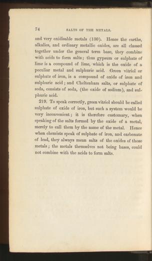 219. To speak correctly, green vitriol should be calledsulphate of oxide of iron, but such a system would bevery inconvenient; it is therefore customary, whenspeaking of the salts formed by the oxide of a metal,merely to call them by the name of the metal. Hencewhen chemists speak of sulphate of iron, and carbonateof lead, they always mean salts of the oxides of thosemetals ; the metals themselves not being bases, couldnot combine with the acids to form salts.