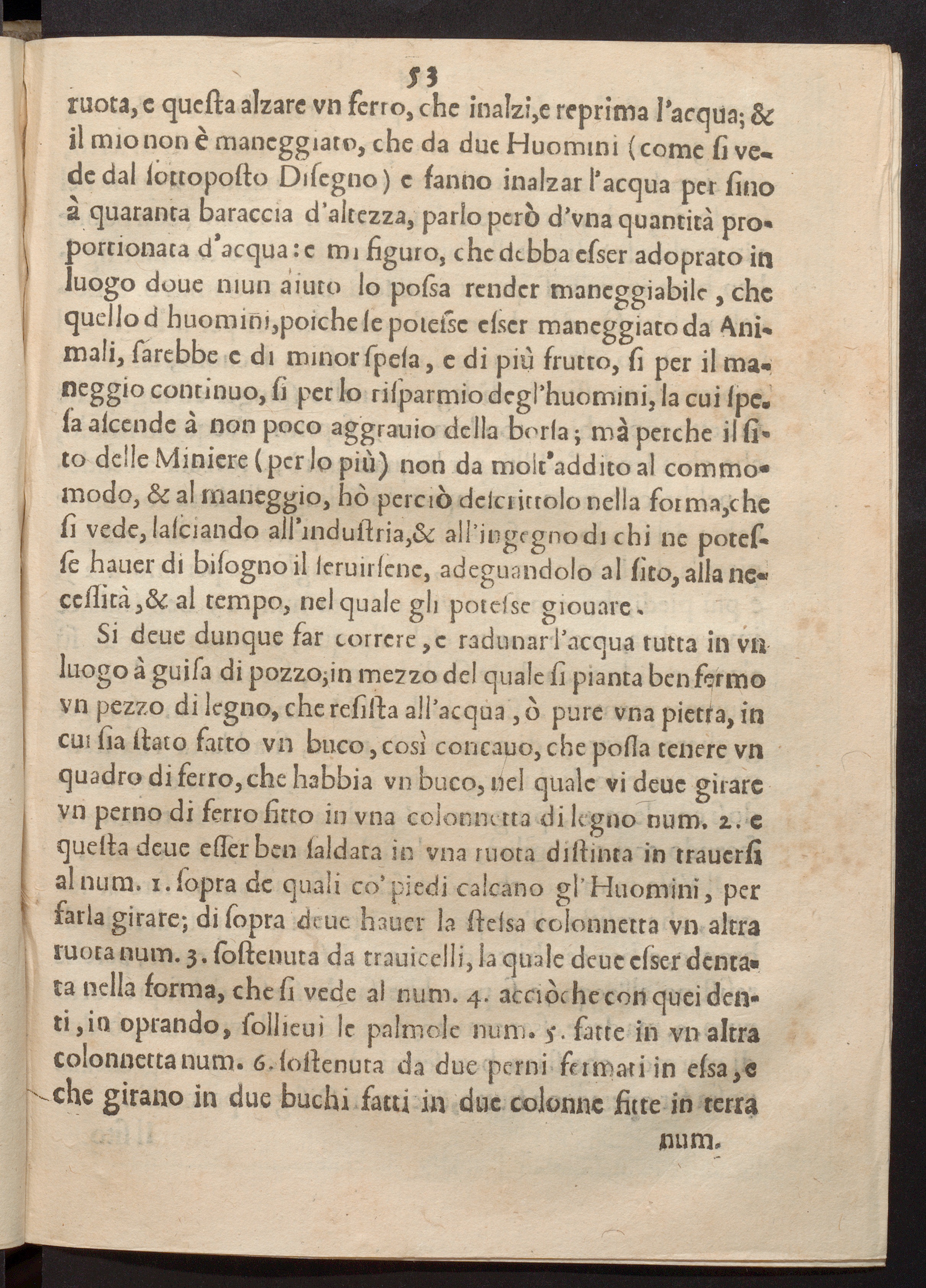 ruota, e queſta alzare vn ferro, che inalzi, e reprima lacquaʒ&il mio non è maneggiato, che da due Nuomini(come ſi ve.de dal ſottopoſto Diſegno) e fanno inalzar acqua per ſinoà quaranta baraccia d'altezza, parlo però d' vna quantità pro-portionata d acqua: e mi figuro, che debba eſser adoprato inluogo doue niun aiuto lo poſsa render maneggiabile, chequello d huom ini, poiche ſe poieſse eſser maneggiato da Ani-mali, ſarebbe e di minor ſpeſa, e di più frutto, ſi per il ma-neggio continuo, ſi per lo riſparmio deglhuomini, la cui pe.a aſcende à non poco aggrauio della borſa; ma perche iſ ſi-to delle Miniere(per lo pi) non da molt addito al commo-modo,& al maneggio, ho pereiò deſcrittolo nella forma, cheſi vede, laſciando all induſtria,& alhioge gno di chi ne poteſ-ſe hauer di biſogno il ſeruirſene, adeguandolo al ſito, alla ne-ceſſita,& al tempo, nel quale gli poteſse giouare.Si deue dunque far correre, e radunar lacqua tutta in vnluogo à guiſa di pozzo; in mezzo del quale ſi pianta ben farmovn pezzo di legno, che reſiſta all acqua, ò pure vna pietta, incui ſia ſtato fatto vn buco, cos concauo, che poſſa tenere vnquadro di ferro, che habbia vn buco, uel quale vi deue girarevn perno di ferro fitto in vna colonnetta di legno num. 2. equeſta deue eſſer ben ſaldata in vna tuota diſtinta in trauerſial num. 1. ſopra de quali co piedi calcano gl Huomini, perfarla girare; di ſopra deue hauer la ſteſsa colonnetta vn altraruota num. 3. ſoſtenuta da trauicelli, la quale deue eſser denta-ta nella forma, che ſi vede al num. 4. acciòche con quei den-ti, in oprando, ſollieui le palmole num. 5. fatte in vn altracolonnetta num. 6. ſoſtenuta da due perni fermati in eſsa, e