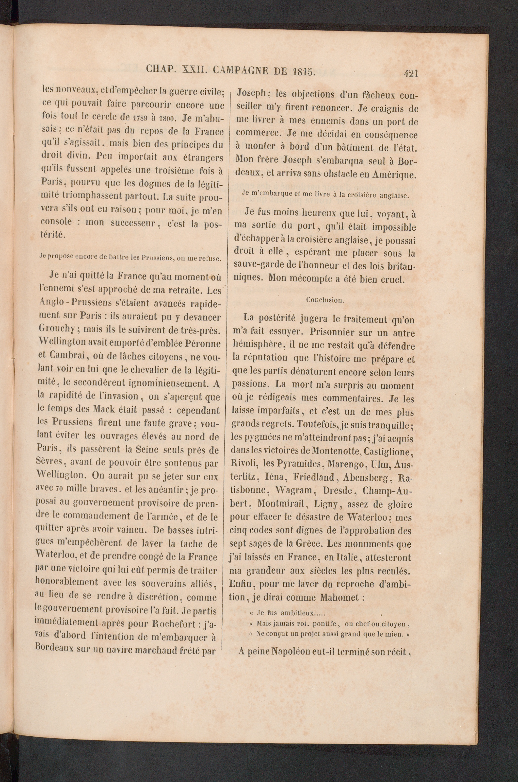La postérité jugera le traitement qu’onm’a fait essuyer. Prisonnier sur un autrehémisphère, il ne me restait qu’à défendrela réputation que l’histoire me prépare etque les partis dénaturent encore selon leurspassions. La mort m’a surpris au momentoù je rédigeais mes commentaires. Je leslaisse imparfaits, et c’est un de mes plusgrands regrets. Toutefois, je suis tranquille ;les pygmées ne m’atteindront pas; j’ai acquisdans les victoires de Montenotte, Castiglione,Rivoli , les Pyramides, Marengo, Hlm, Aus-terlitz, Iéna, Friedland, Abensberg , Ra-tisbonne, Wagram, Dresde , Champ-Au-bert, Montmirail , Ligny, assez de gloirepour effacer le désastre de Waterloo ; mescinq codes sont dignes de l’approbation dessept sages de la Grèce . Les monuments quej’ai laissés en France , en Italie , attesterontma grandeur aux siècles les plus reculés.Enfin, pour me laver du reproche d’ambi-tion, je dirai comme Mahomet :