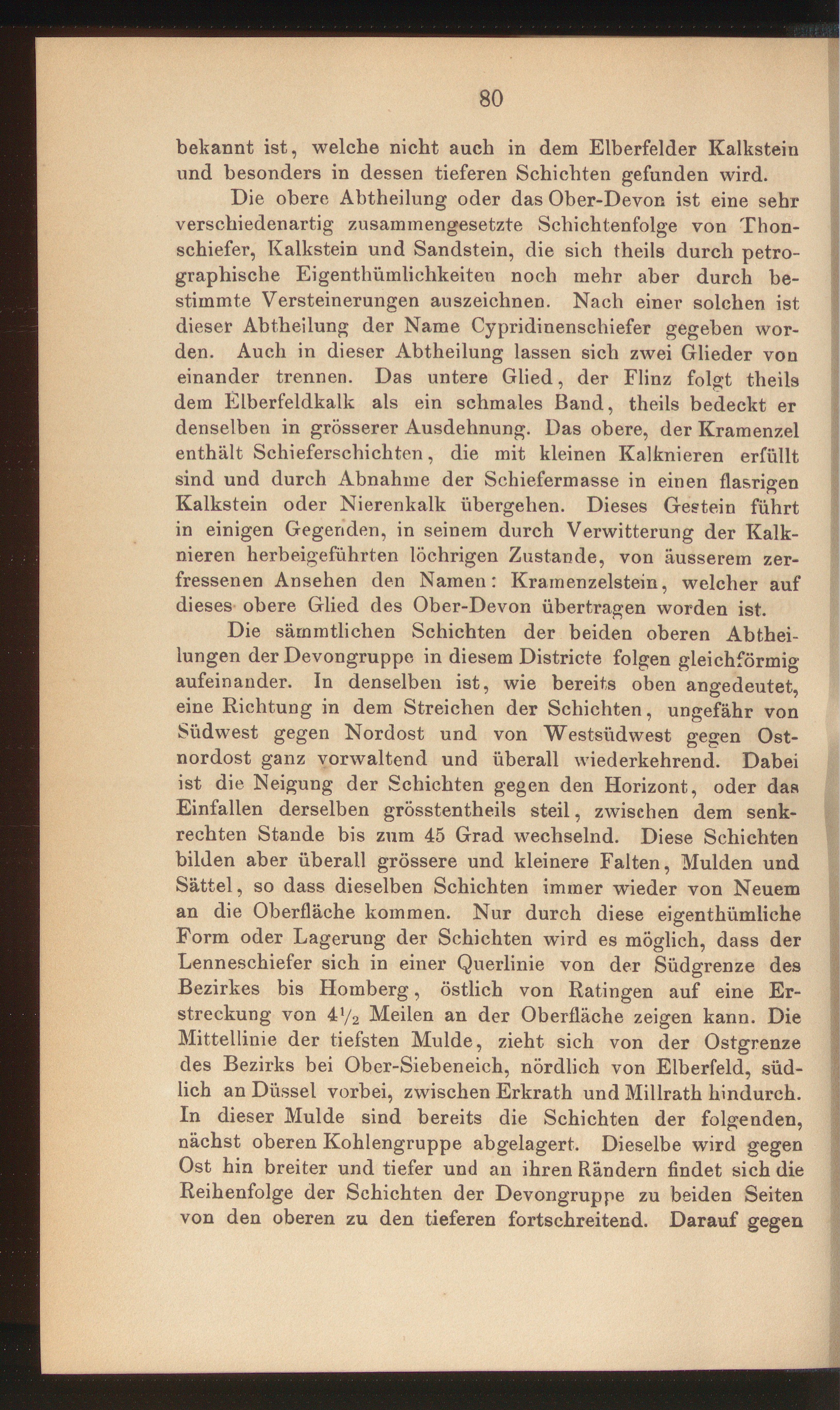 Die sämmtlichen Schichten der beiden oberen Abthei-lungen der Devongruppe in diesem Districte folgen gleichförmigaufeinander. In denselben ist, wie bereits oben angedeutet,eine Richtung in dem Streichen der Schichten, ungefähr vonSüdwest gegen Nordost und von Westsüdwest gegen Ost-nordost ganz vorwaltend und überall wiederkehrend. Dabeiist die Neigung der Schichten gegen den Horizont, oder dasEinfallen derselben grösstentheils steil, zwischen dem senk-rechten Stande bis zum 45 Grad wechselnd. Diese Schichtenbilden aber überall grössere und kleinere Falten, Mulden undSättel, so dass dieselben Schichten immer wieder von Neueman die Oberfläche kommen. Nur durch diese eigenthümlicheForm oder Lagerung der Schichten wird es möglich, dass derLenneschiefer sich in einer Querlinie von der Südgrenze desBezirkes bis Homberg, östlich von Ratingen auf eine Er-streckung von 4y 2 Meilen an der Oberfläche zeigen kann. DieMittellinie der tiefsten Mulde, zieht sich von der Ostgrenzedes Bezirks bei Ober-Siebeneich, nördlich von Elberfeld, süd-lich an Düssei vorbei, zwischen Erkrath und Millrath hindurch.In dieser Mulde sind bereits die Schichten der folgenden,nächst oberen Kohlengruppe abgelagert. Dieselbe wird gegenOst hin breiter und tiefer und an ihren Rändern findet sich dieReihenfolge der Schichten der Devongruppe zu beiden Seitenvon den oberen zu den tieferen fortschreitend. Darauf gegen