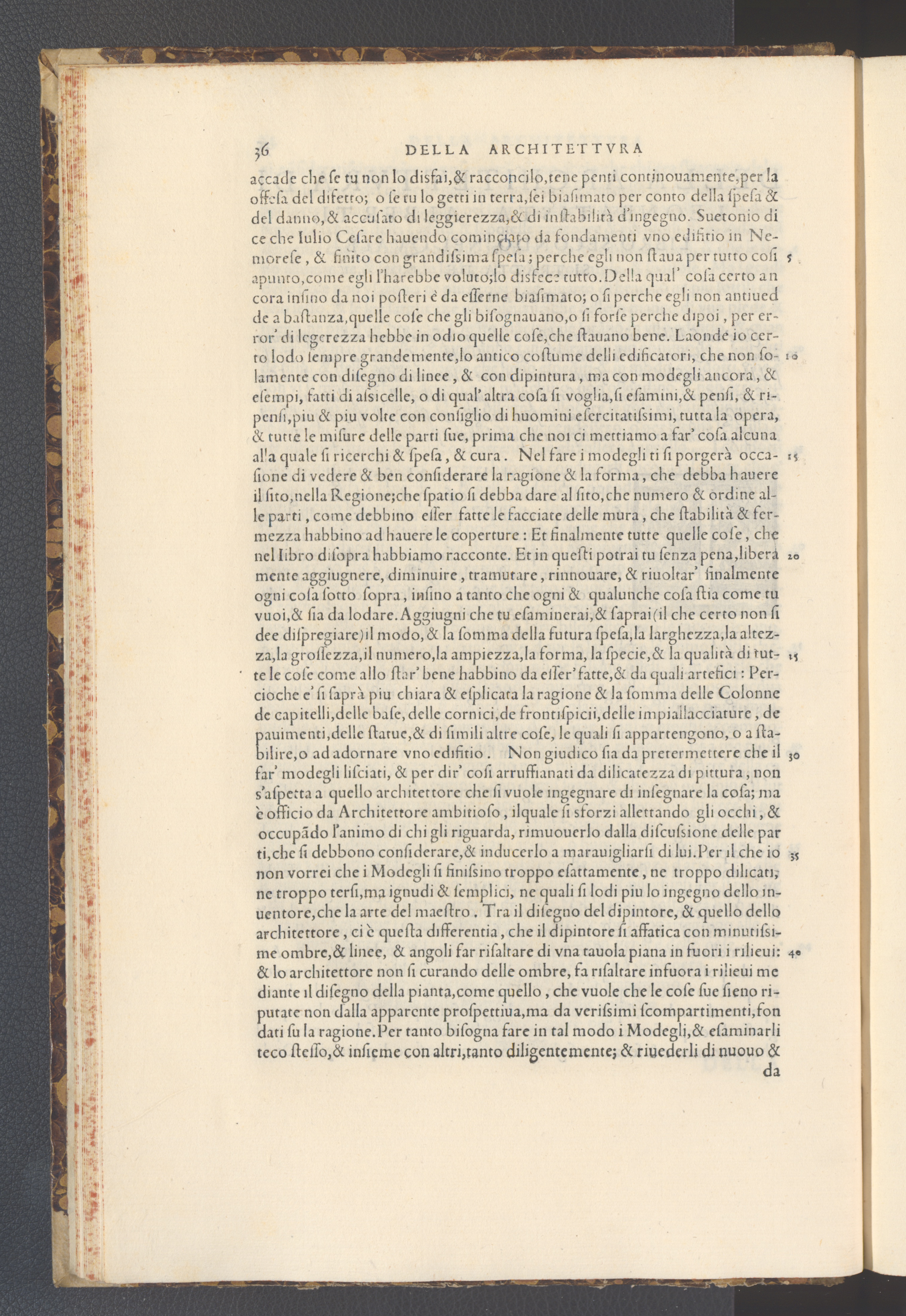 accade che ſe tu non lo disfai,& racconcilo, tene penti continouamente, per laoffela del difetto; o ſe tu lo getti in terra, ſei biaſimato per conto della ſpeſa&del danno,& accuſato di leggierezza,& di inſtabilità dingegno. Suetonio dice che lulio Ceſare hauendo cominęiato da fondamenti vno edifitio in Ne-moreſe,& finito con grandiſsima(peta; perche egli non ftaua per tutto cofiapunto, come egli Tharebbe volutozlo disfecz tutto. Della qual’ coſa certo ancora inſino da noi poſteri è da eſſerne biaſimatoʒ o fi perche egli non antiuedde a baſtanza, quelle coſe che gli biſognauano, o ſi forſe perche dipoi, per er-ror di ſegerezza hebbe in odio quelle coſe, che ſtauano bene. Laonde io cer-to lodo ſempre grande mente, lo antico coſtume delli edificatori, che non ſo-lamente con diſegno di linee,& con dipintura, ma con modegli ancora,&eſempi, fatti di aſsicelle, o di qual’ altra coſa fi voglia, ſi eſamini,& penſi,& ri-penſi, piu& piu volte con conſiglio di huomini eſercitatiſsimi, tutta la opera,& tutte le miſure delle parti fue, prima che noi ci mettiamo a far’ coſa alcunaalla quale ſi ricerchi& ſpeſa,& cura. Nel fare i modegli ti fi porgerà occa-ſione di vedere& ben conſiderare la ragione& la forma, che debba hauereil ſito, nella Regionezche{patio fi debba dare al ſito, che numero& ordine al-le parti, come debbino eſſer fatte le facciate delle mura, che ſtabilità& fer-mezza habbino ad hauere le coperture: Et finalmente tutte quelle coſe, chenel libro diſopra habbiamo racconte. Et in queſti potrai tu ſenza pena, liberamente aggiugnere, diminuire, tramutare, rinnouare,& riuoltar finalmenteogni cola fotto fopra, infino a tanto che ogni& qualunche cofa ftia come tuvuoi,& fia da lodare. Aggiugni che tu eſaminerai,& faprai(il che certo non fidee diſpregiare)il modo,& la ſomma della futura ſpeſa, la larghezza,la altez-za,la groflezza,il numero, la ampiezza, la forma, la ſpecie,& la qualit di tut-te le coſe come allo ſtar bene habbino da eſſerꝰ fatte,& da quali artefici: Per-cioche e ſi ſaprꝭ piu chiara& eſplicata la ragione& la ſomma delle Colonnede capitelli, delle baſe, delle cornici, de frontiſpicii, delle impiallacciature, depauimenti, delle ſtatue,& di ſimili altre coſe, le quali fi appartengono, o a ſta-bilire, o ad adornare vno edifitio. Non giudico ſia da pretermettere che ilfar modegli liſciati,& per dir’ coſi arruffianati da dilicatezza di pittura; nons'afpettaa quello architettore che fi vuole ingegnare di infegnare la cofa; mae officio da Architettore ambitioſo, ilquale fi sforzi allettando gli occhi,&occupãdo l'animo di chi gli riguarda, rimuouerlo dalla diſcuſsione delle parti, che ſi debbono conſiderare,& inducerlo a marauigliarſi di lui. Per il che ionon vorrei che i Modegli fi finiſsino troppo eſattamente, ne troppo dilicatine troppo terſi, ma ignudi& ſemplici, ne quali ſi lodi piu lo ingegno dello in-uentore, che la arte del maeſtro. Tra il diſegno del dipintore,& quello delloarchitettore, ci è que ſta differentia, che il dipintore fi affatica con minutiſsi-me ombre,& linee,& angoli far riſaltare di vna tauola piana in fuori i rilieui:& lo architettore non fi curando delle ombre, fa riſaltare infuora i rilieui mediante il diſegno della pianta, come quello, che vuole che le coſe ſue ſieno ri-putate non dalla apparente proſpettiua, ma da veriſsimi ſcompartimenti, fondati fu la ragione. Per tanto biſogna fare in tal modo i Modegli,& eſaminarliteco ſteſſo,& inſieme con altri, tanto diligentemente;& rivederli di nuouo&