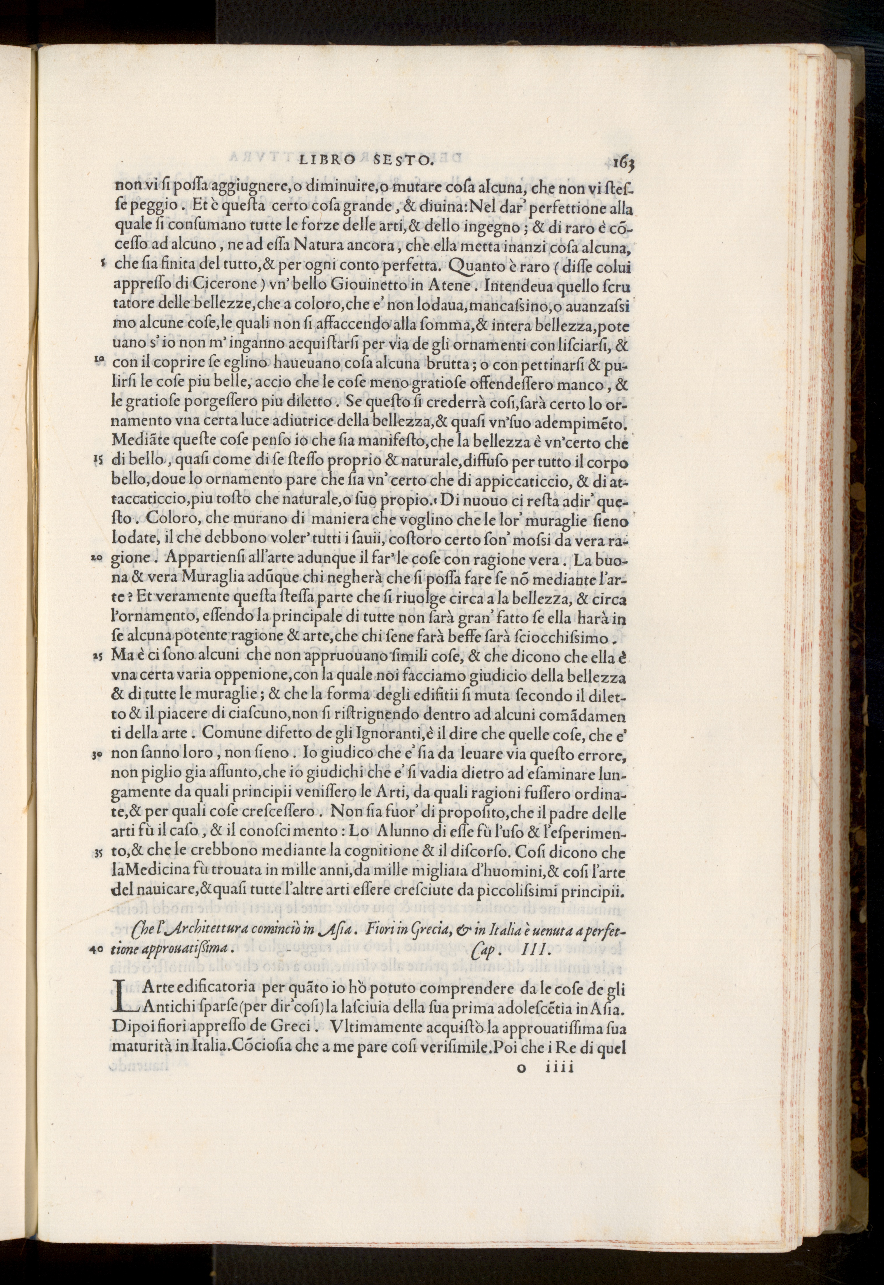 hel. Architettura cominciò in Aſia. Fiori in Grecia,& in Italia è uenuta a perſet-tione approuatiſſima. i Cab. III.