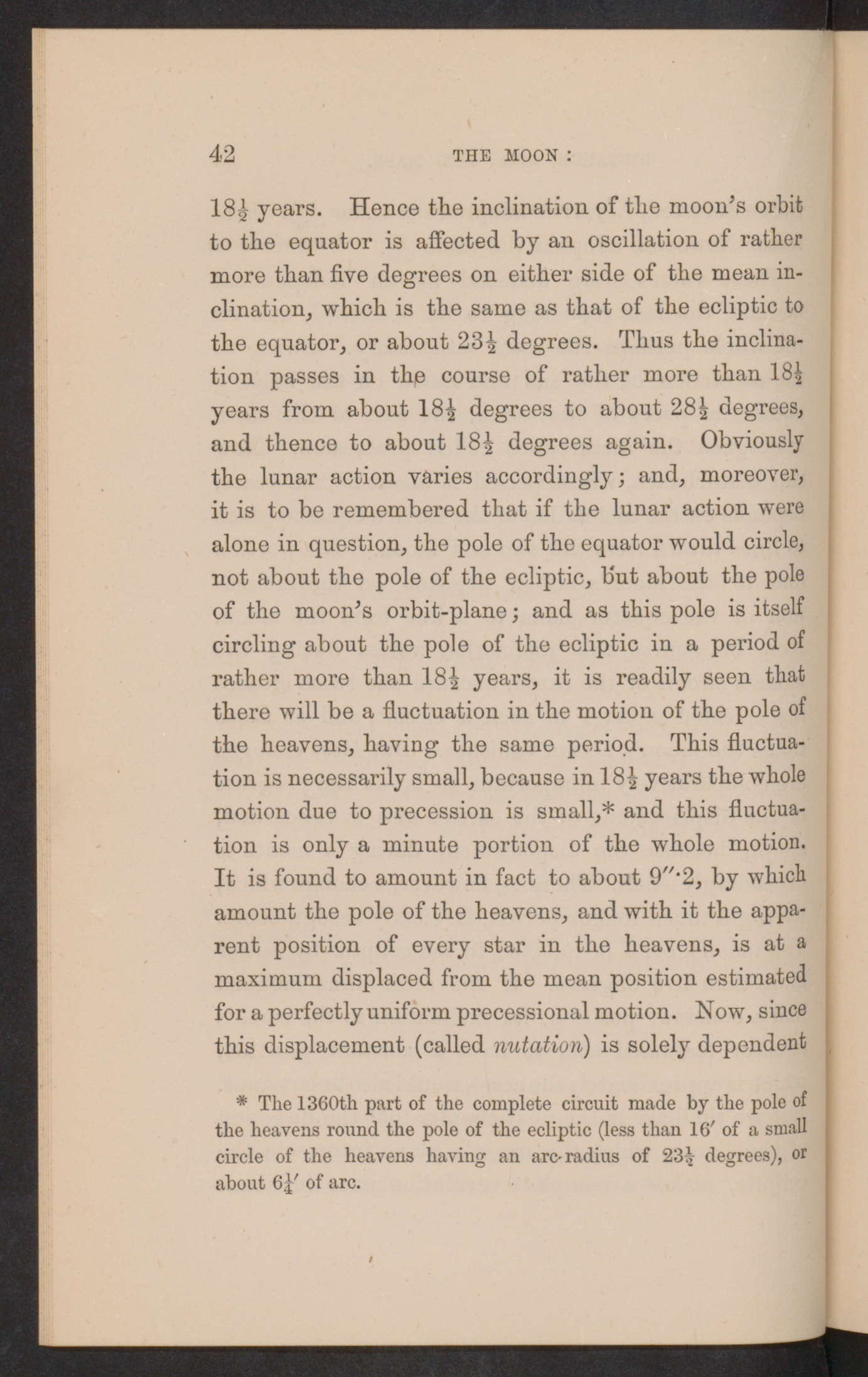 18| years. Hence the inclination of the moon’s orbitto the equator is affected by an oscillation of rathermore than five degrees on either side of the mean in-clination, which is the same as that of the ecliptic tothe equator, or about 23| degrees. Thus the inclina-tion passes in the course of rather more than 18|years from about 18^ degrees to about 28^ degrees,and thence to about 18^ degrees again. Obviouslythe lunar action varies accordingly; and, moreover,it is to be remembered that if the lunar action werealone in question, the pole of the equator would circle,not about the pole of the ecliptic, but about the poleof the moon’s orbit-plane; and as this pole is itself Icircling about the pole of the ecliptic in a period of |rather more than 18^ years, it is readily seen thatthere will be a fluctuation in the motion of the pole ofthe heavens, having the same period. This fluctua- ,tion is necessarily small, because in 18^ years the whole jmotion due to precession is small,* and this fluctua- jtion is only a minute portion of the whole motion.