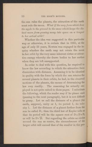 the sun rules the planets, the attraction of the earthmust rule the moon. What if the very force which drewthe apple to the ground he the same which keeps the dis-tant moon from passing away into space on ' a tangentto her actual orbit !