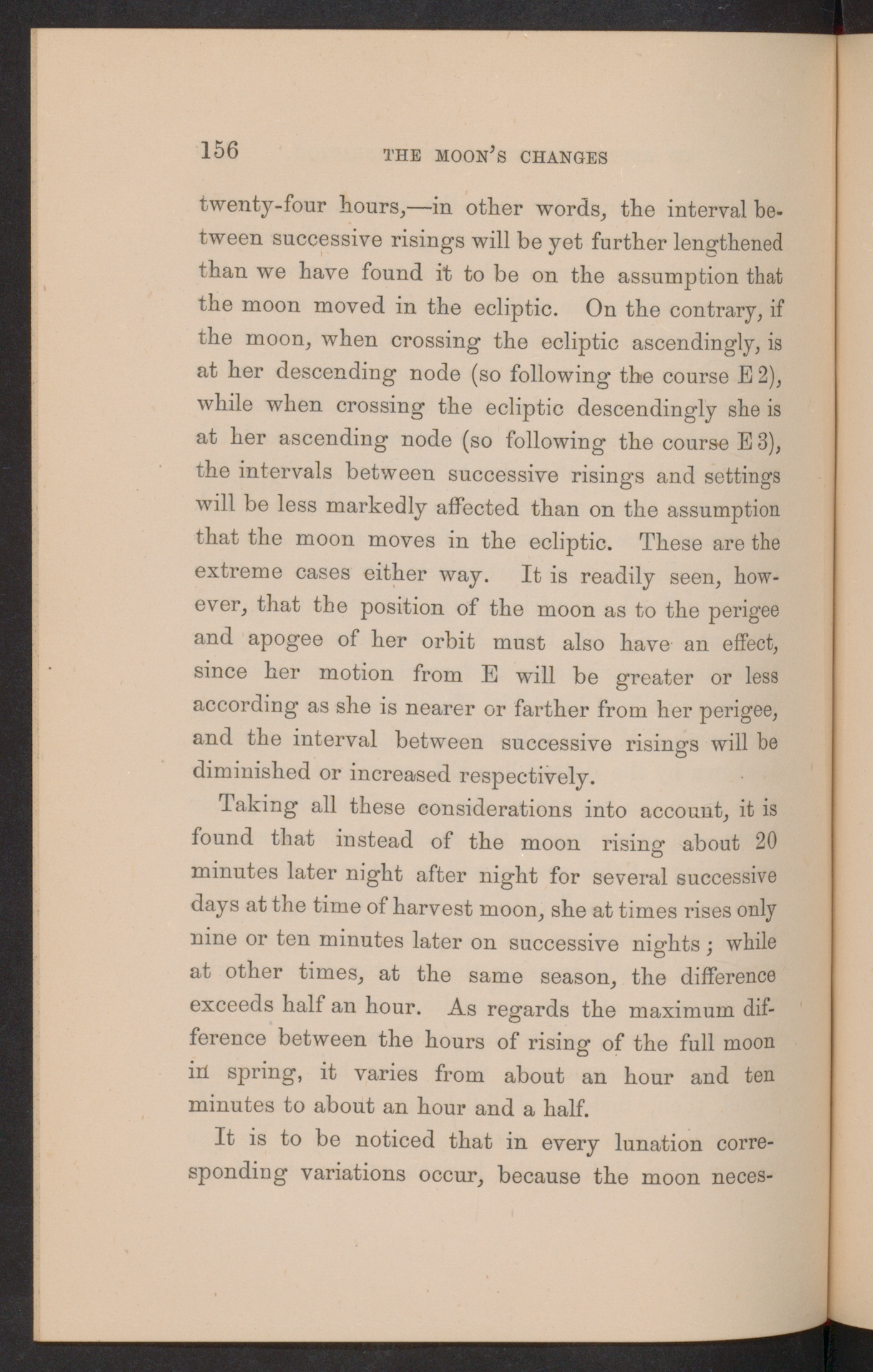 twenty-four hours,—in other words, the interval be-tween successive risings will be yet further lengthenedthan we have found it to be on the assumption thatthe moon moved in the ecliptic. On the contrary, ifthe moon, when crossing the ecliptic ascendingly, isat her descending node (so following the course E 2),while when crossing the ecliptic descendingly she isat her ascending node (so following the course E 3),the intervals between successive risings and settingswill be less markedly affected than on the assumptionthat the moon moves in the ecliptic. These are theextreme cases either way. It is readily seen, how-ever, that the position of the moon as to the perigeeand apogee of her orbit must also have an effect,since her motion from E will be greater or lessaccording as she is nearer or farther from her perigee,and the interval between successive risings will bediminished or increased respectively.
