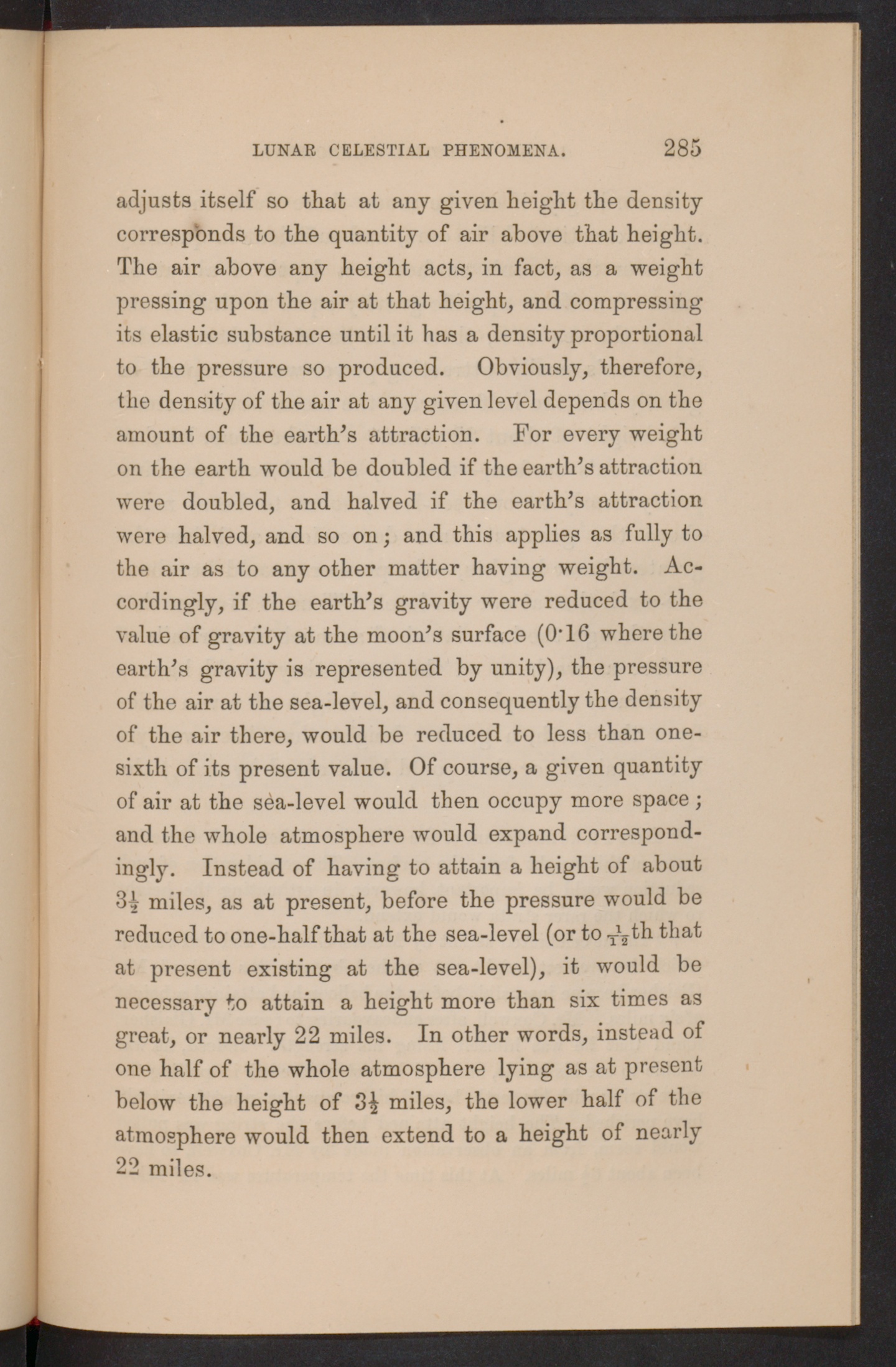 adjusts itself so that at any given height the densitycorrespbnds to the quantity of air above that height.The air above any height acts, in fact, as a weightpressing upon the air at that height, and compressingits elastic substance until it has a density proportionalto the pressure so produced. Obviously, therefore,the density of the air at any given level depends on theamount of the earth’s attraction. For every weighton the earth would be doubled if the earth’s attractionwere doubled, and halved if the earth’s attractionwere halved, and so on ; and this applies as fully tothe air as to any other matter having weight. Ac-cordingly, if the earth’s gravity were reduced to thevalue of gravity at the moon’s surface (0'16 where theearth’s gravity is represented by unity), the pressureof the air at the sea-level, and consequently the densityof the air there, would be reduced to less than one-sixth of its present value. Of course, a given quantityof air at the sea-level would then occupy more space ;and the whole atmosphere would expand correspond-ingly. Instead of having to attain a height of aboutmiles, as at present, before the pressure would bereduced to one-half that at the sea-level (or to -Jjth thatat present existing at the sea-level), it would benecessary to attain a height more than six times asgreat, or nearly 22 miles. In other words, instead ofone half of the whole atmosphere lying as at presentbelow the height of 3^ miles, the lower half of theatmosphere would then extend to a height of nearly22 miles.