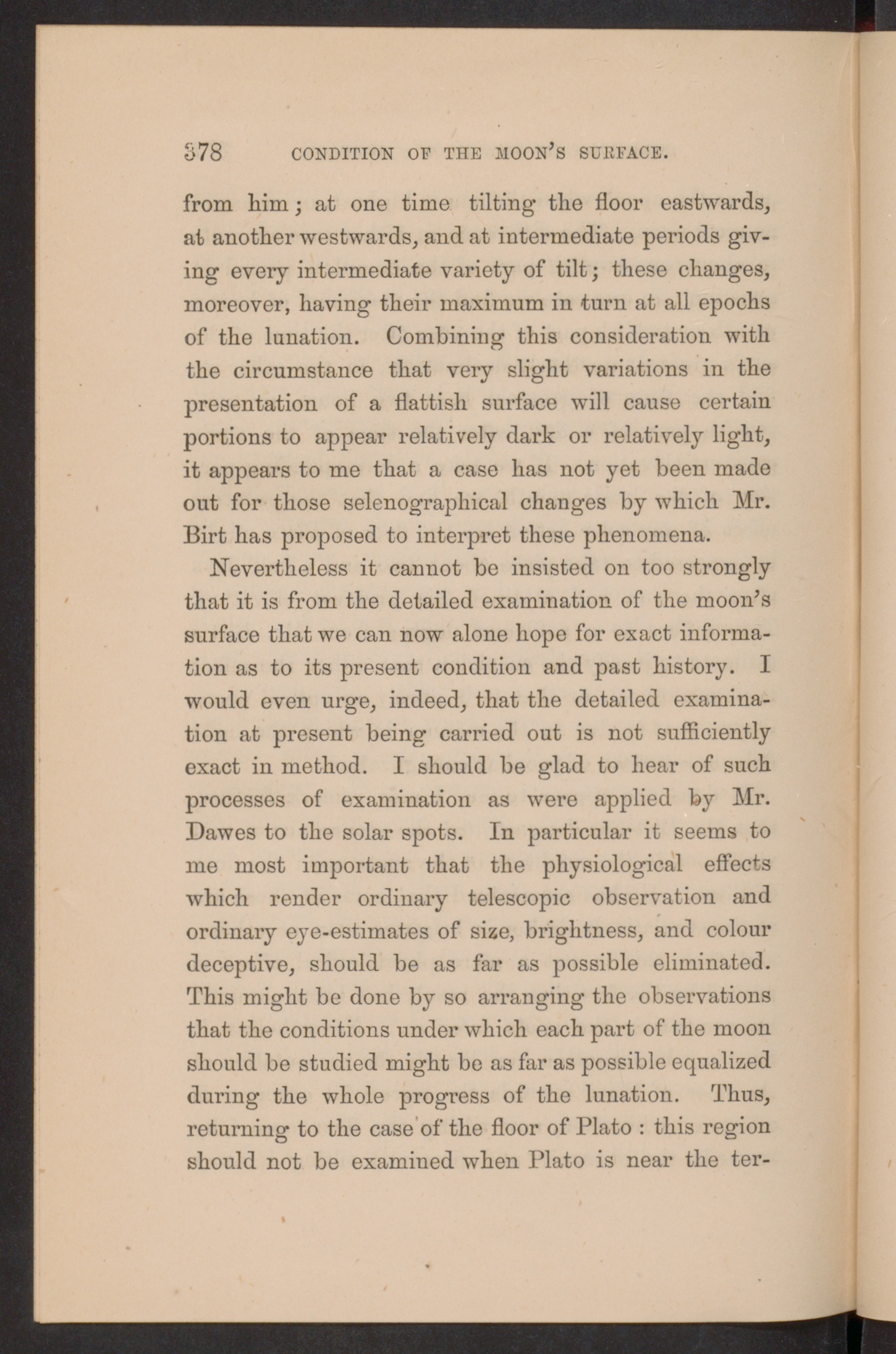 Nevertheless it cannot be insisted on too stronglythat it is from the detailed examination of the moon’ssurface that we can now alone hope for exact informa-tion as to its present condition and past history. Iwould even urge, indeed, that the detailed examina-tion at present being carried out is not sufficientlyexact in method. I should be glad to hear of suchprocesses of examination as were applied by Mr.Dawes to the solar spots. In particular it seems tome most important that the physiological effectswhich render ordinary telescopic observation andordinary eye-estimates of size, brightness, and colourdeceptive, should be as far as possible eliminated.This might be done by so arranging the observationsthat the conditions under which each part of the moonshould be studied might be as far as possible equalizedduring the whole progress of the lunation. Thus,returning to the case of the floor of Plato : this regionshould not be examined when Plato is near the ter-