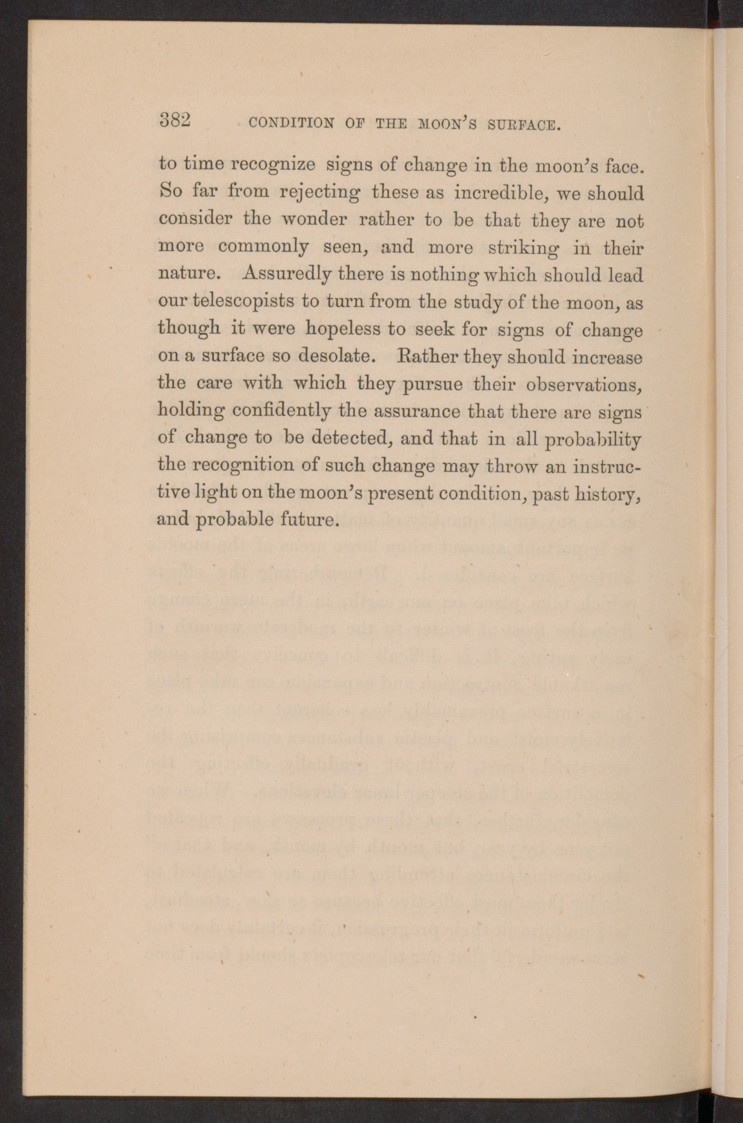 to time recognize signs of change in the moon’s face.So far from rejecting these as incredible, we shouldconsider the wonder rather to he that they are notmore commonly seen, and more striking in theirnature. Assuredly there is nothing which should leadour telescopists to turn from the study of the moon, asthough it were hopeless to seek for signs of changeon a surface so desolate. Rather they should increasethe care with which they pursue their observations,holding confidently the assurance that there are signsof change to be detected, and that in all probabilitythe recognition of such change may throw an instruc-tive light on the moon’s present condition, past history,and probable future.