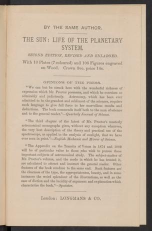 “We can but be struck here with the wonderful richness ofexpression which Mr. Proctor possesses, and which he exercises soadmirably and judiciously. Astronomy, which has been everadmitted to be the grandest and sublimest of the sciences, requiressuch language to give full force to her marvellous results anddeductions. The book commends itself both to the man of scienceand to the general reader.”— Quarterly Journal of Science.