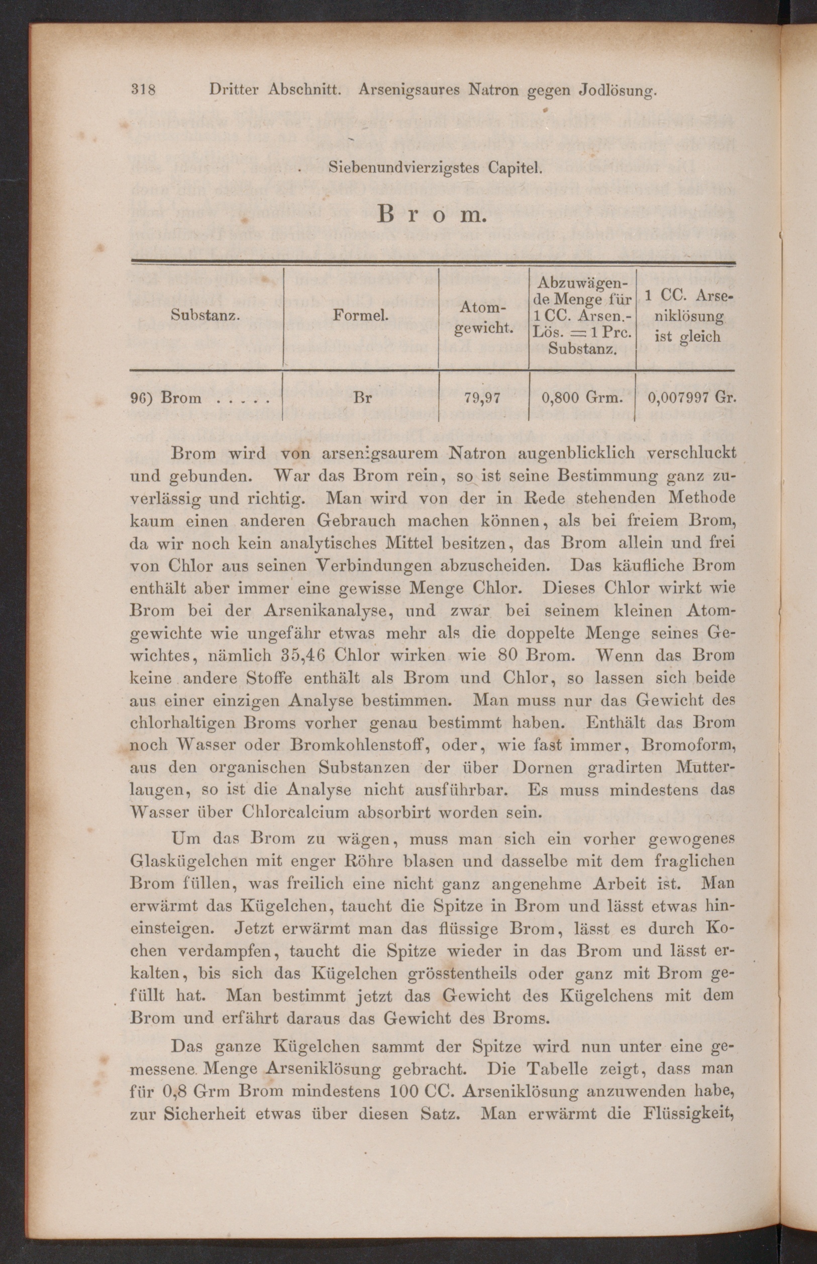 Das ganze Kügelchen sammt der Spitze wird nun unter eine ge-messene. Menge Arseniklösung gebracht. Die Tabelle zeigt, dass manfür 0,8 Grm Brom mindestens 100 CC. Arseniklösung anzuwenden habe,zur Sicherheit etwas über diesen Satz. Man erwärmt die Flüssigkeit,