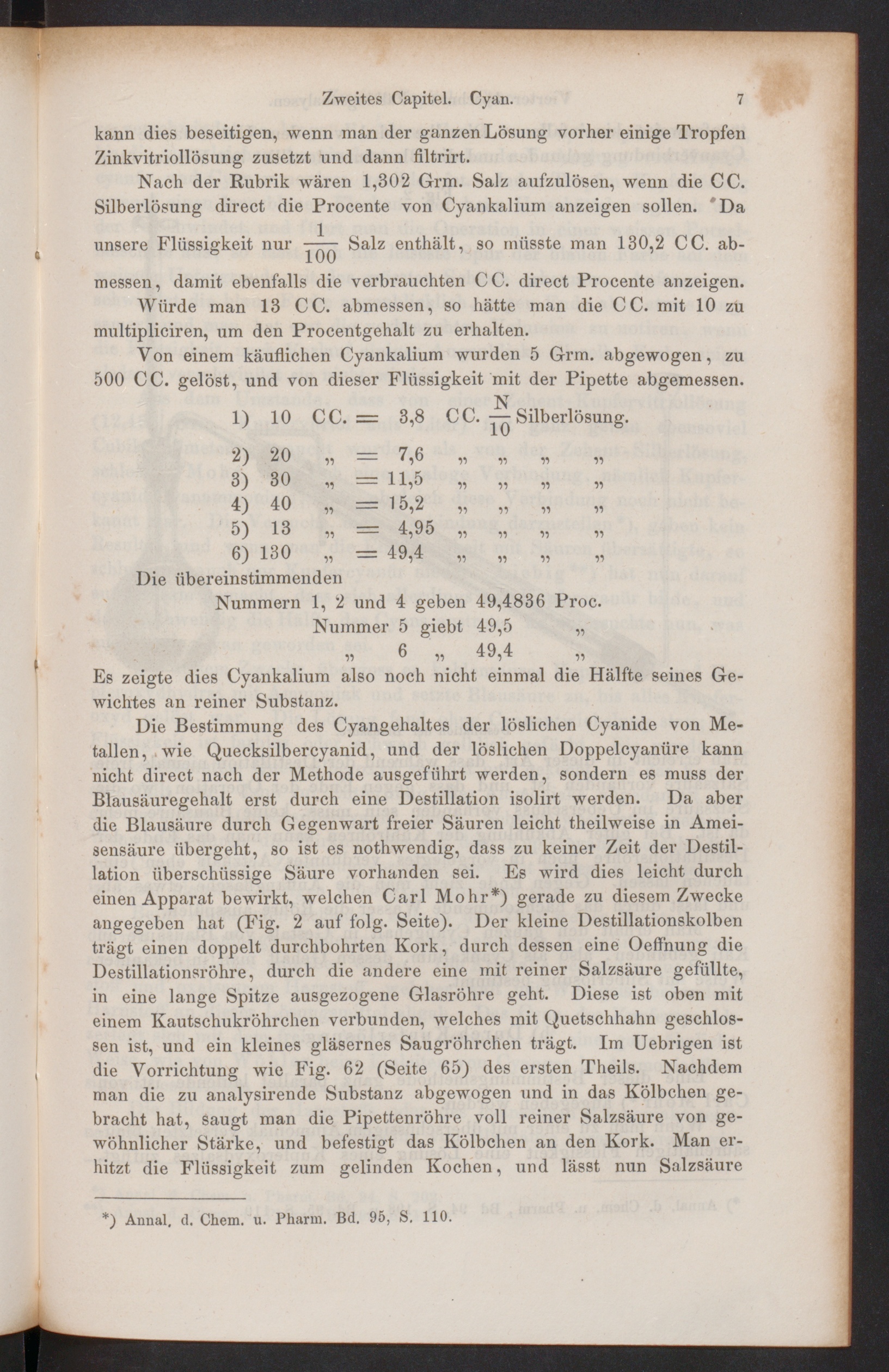 Die Bestimmung des Cyangehaltes der löslichen Cyanide von Me-tallen, wie Quecksilbercyanid, und der löslichen Doppelcyanüre kannnicht direct nach der Methode ausgeführt werden, sondern es muss derBlausäuregehalt erst durch eine Destillation isolirt werden. Da aberdie Blausäure durch Gegenwart freier Säuren leicht theilweise in Amei-sensäure übergeht, so ist es nothwendig, dass zu keiner Zeit dev Destil-lation überschüssige Säure vorhanden sei. Es wird dies leicht durcheinen Apparat bewirkt, welchen Carl Mohr*) gerade zu diesem Zweckeangegeben hat (Fig. 2 auf folg. Seite). Der kleine Destillationskolbenträgt einen doppelt durchbohrten Kork, durch dessen eine Oeff'nung dieDestillationsröhre, durch die andere eine mit reiner Salzsäure gefüllte,in eine lange Spitze ausgezogene Glasröhre geht. Diese ist oben miteinem Kautschukröhrchen verbunden, welches mit Quetschhahn geschlos-sen ist, und ein kleines gläsernes Saugröhrchen trägt. Im Uebrigen istdie Vorrichtung wie Fig. 62 (Seite 65) des ersten Theils. Nachdemman die zu analysirende Substanz abgewogen und in das Kölbchen ge-bracht hat, saugt man die Pipettenröhre voll reiner Salzsäure von ge-wöhnlicher Stärke, und befestigt das Kölbchen an den Kork. Man er-hitzt die Flüssigkeit zum gelinden Kochen, und lässt nun Salzsäure