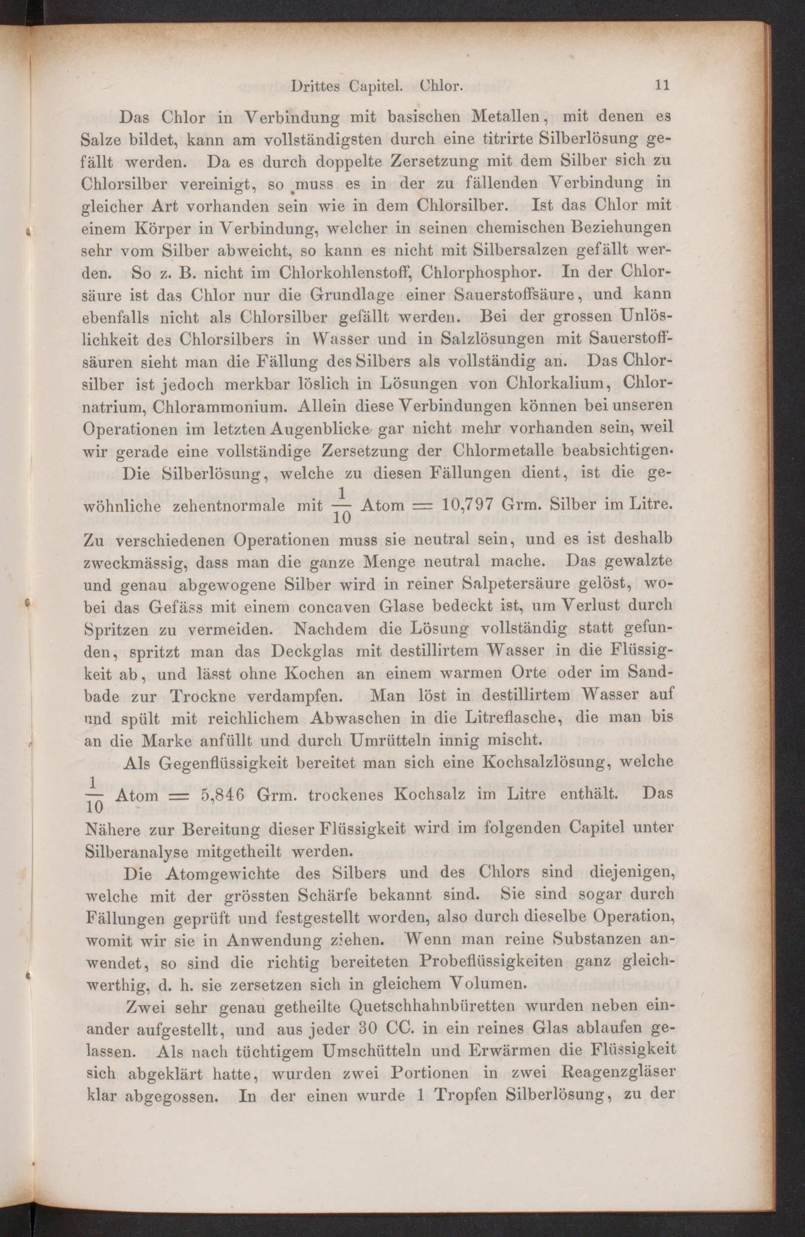 Die Atomgewichte des Silbers und des Chlors sind diejenigen,welche mit der grössten Schärfe bekannt sind. Sie sind sogar durchFällungen geprüft und festgestellt worden, also durch dieselbe Operation,womit wir sie in Anwendung ziehen. Wenn man reine Substanzen an-wendet, so sind die richtig bereiteten Probeflüssigkeiten ganz gleich-werthig, d. h. sie zersetzen sich in gleichem Volumen.