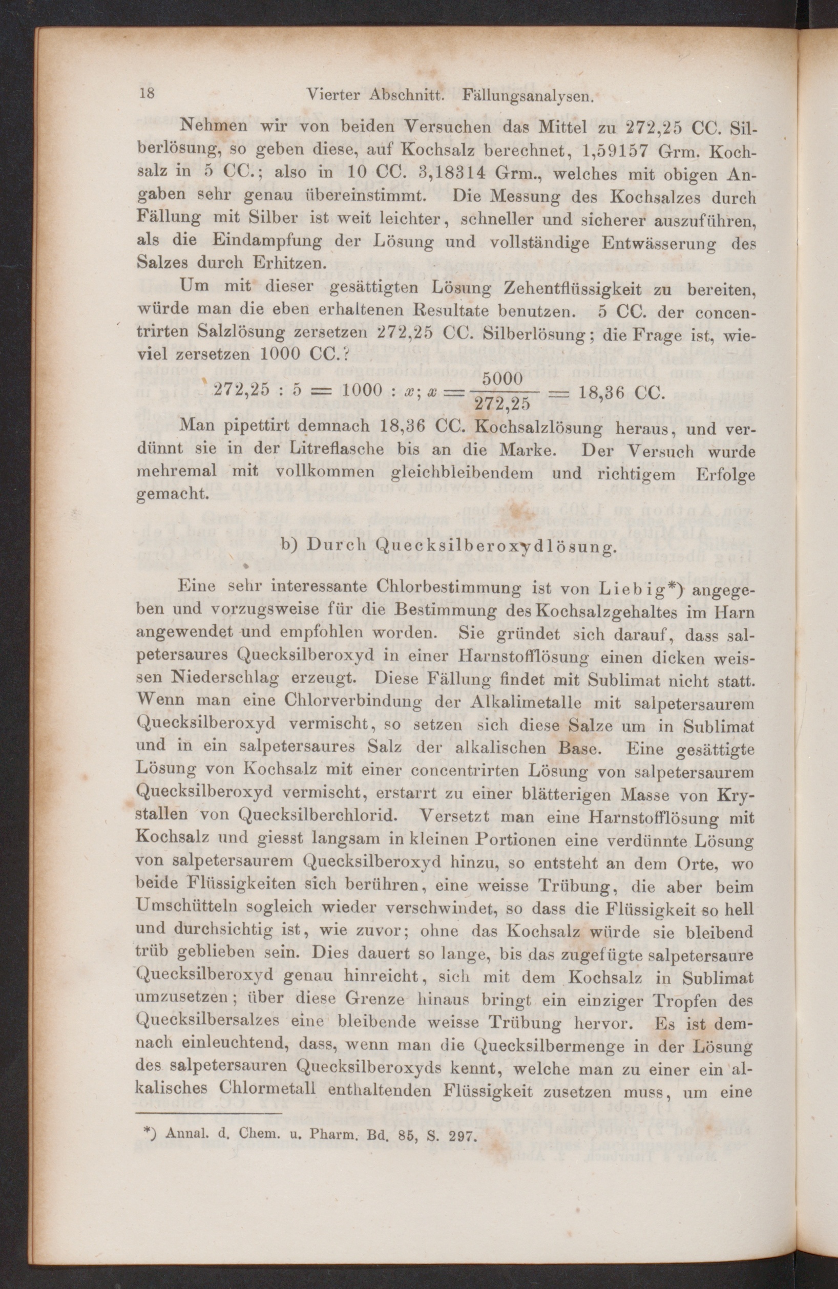 Um mit dieser gesättigten Lösung Zehentflüssigkeit zu bereiten,würde man die eben erhaltenen Resultate benutzen. 5 CC. der concen-trirten Salzlösung zersetzen 272,25 CC. Silberlösung; die Frage ist, wie-viel zersetzen 1000 CC.?