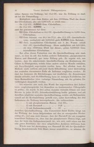 derselben Quecksilberlösung. Der Unterschied dieser Zahlen hängt vonder Wirkung der freien Salpetersäure auf den zu erzeugenden Nieder-schlag ab, und man sieht hieraus, dass der Harnstoff der am wenigstenbrauchbare Indicator ist, dass ihm das phosphorsaure Natron folgt, unddass der beste das Kaliumeisencyanid ist, wie sich auch schon aus densehr guten llesultaten der oben mitgetheilten Analysen schliessen liess.