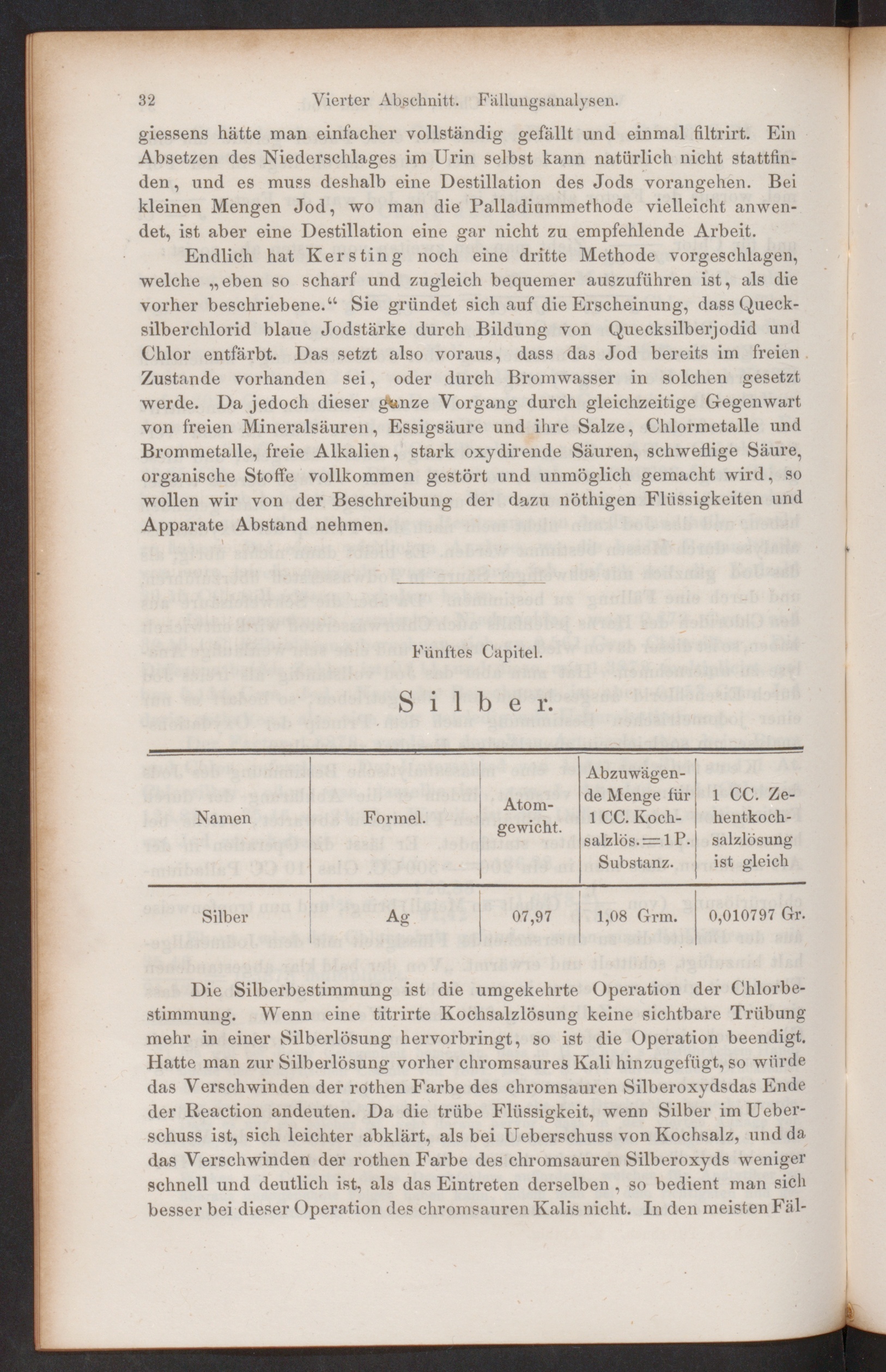 Die Silberbestimmung ist die umgekehrte Operation der Chlorbe-stimmung. Wenn eine titrirte Kochsalzlösung keine sichtbare Trübungmehr in einer Silberlösung hervorbringt, so ist die Operation beendigt.Hatte man zur Silberlösung vorher chromsaures Kali hinzugefügt, so würdedas Verschwinden der rothen Farbe des chromsauren Silberoxydsdas Endeder Reaction andeuten. Da die trübe Flüssigkeit, wenn Silber imUeber-schuss ist, sich leichter abklärt, als bei Ueberschuss von Kochsalz, und dadas Verschwinden der rothen Farbe des chromsauren Silberoxyds wenigerschnell und deutlich ist, als das Eintreten derselben , so bedient man sichbesser bei dieser Operation des chromsauren Kalis nicht. In den meisten Fäl-