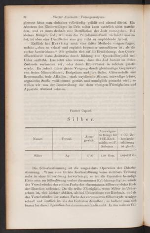 Endlich hat Kersting noch eine dritte Methode vorgeschlagen,welche „eben so scharf und zugleich bequemer auszuführen ist, als dievorher beschriebene.“ Sie gründet sich auf die Erscheinung, dass Queck-silberchlorid blaue Jodstärke durch Bildung von Quecksilberjodid undChlor entfärbt. Das setzt also voraus, dass das Jod bereits im freienZustande vorhanden sei, oder durch Bromwasser in solchen gesetztwerde. Da jedoch dieser glanze Vorgang durch gleichzeitige Gegenwartvon freien Mineralsäuren, Essigsäure und ihre Salze, Chlormetalle undBrommetalle, freie Alkalien, stark oxydirende Säuren, schweflige Säure,organische Stoffe vollkommen gestört und unmöglich gemacht wird, sowollen wir von der Beschreibung der dazu nöthigen Flüssigkeiten undApparate Abstand nehmen.