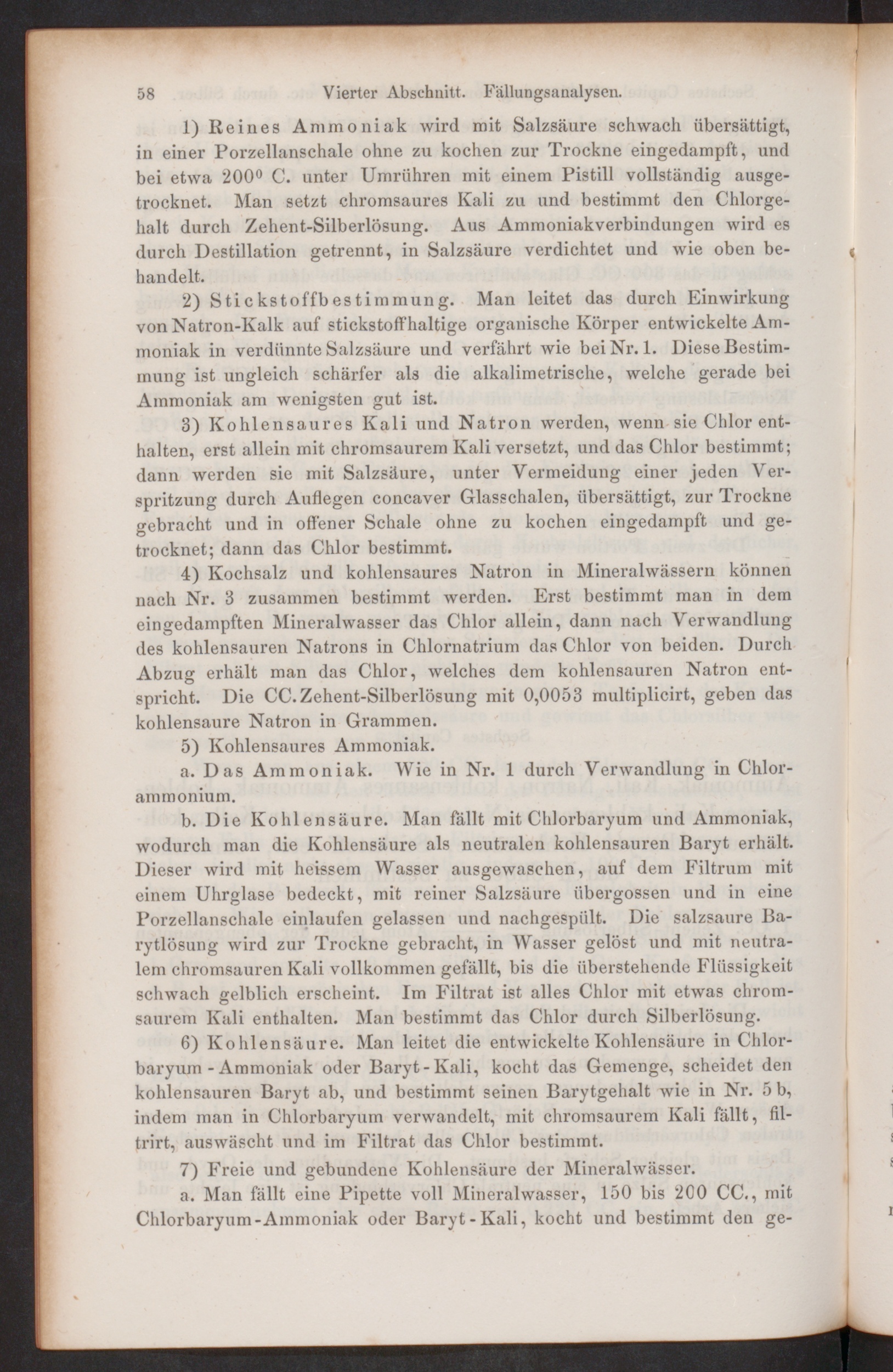 1) Keines Ammoniak wird mit Salzsäure schwach übersättigt,in einer Porzellanschale ohne zu kochen zur Trockne eingedampft, undbei etwa 200° C. unter Umrühren mit einem Pistill vollständig ausge-trocknet. Man setzt chromsaures Kali zu und bestimmt den Chlorge-halt durch Zehent-Silberlösung. Aus Ammoniakverbindungen wird esdurch Destillation getrennt, in Salzsäure verdichtet und wie oben be-handelt.