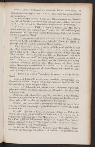 13) Alkaligehalt in Mineralien. Man schliesst das Pulver desMinerals mit irgend einem alkalifreien Stoffe auf, z. B. den von Smithangegebenen Gemengen auf 1 Thl. Mineralpulver, 1 Thl. Flussspath, 4bis 5 Thle. gefälltem kohlensauren Kalk; oder: 5 bis 6 Thle. kohlen-saurem Kalk und 1/ 3 bis 3 / 4 Thle. Salmiak; oder 3 bis 4 Thle. kohlen-saurem Baryt und 2 Thle. Chlorbarium.