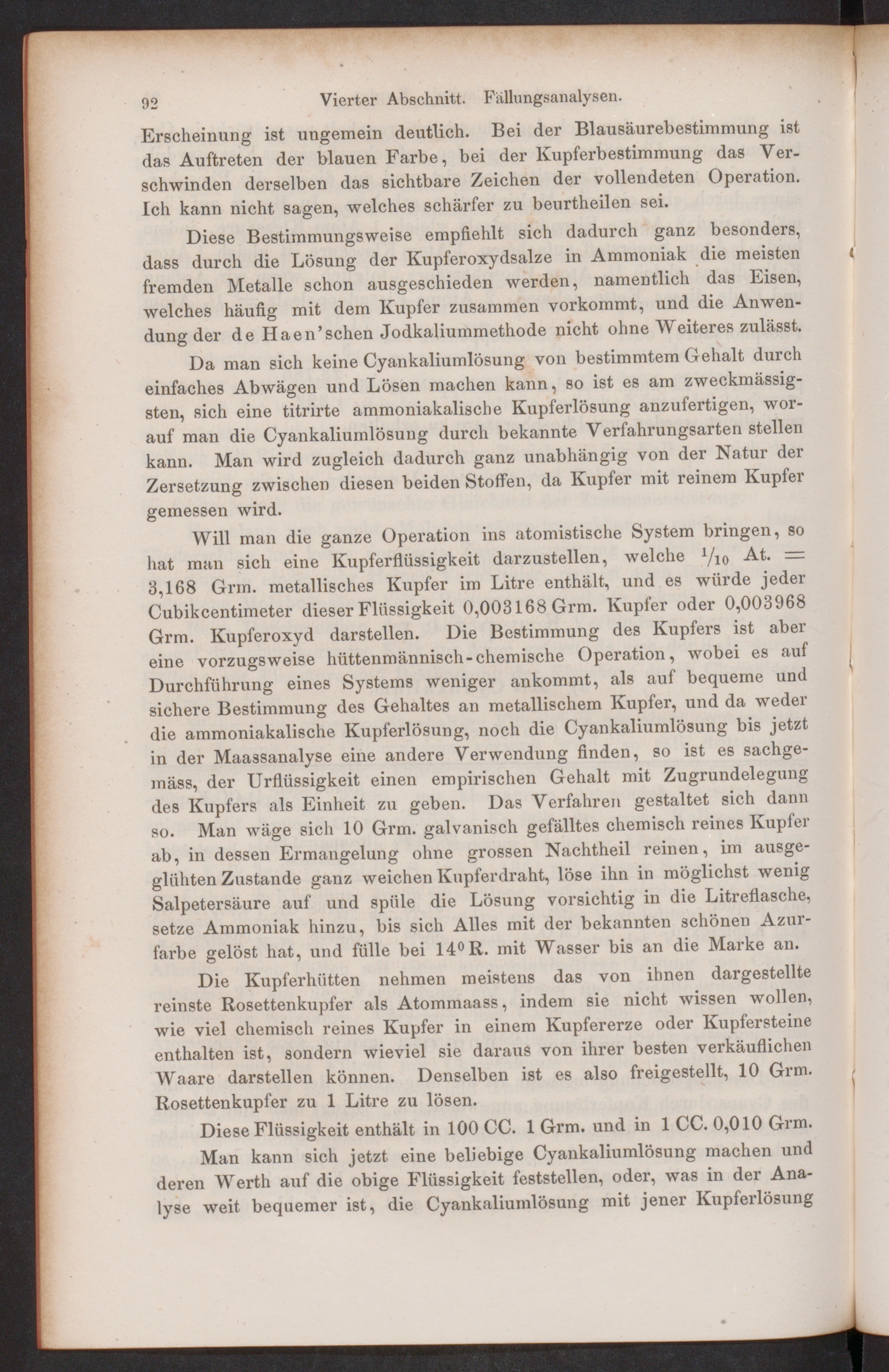 Will man die ganze Operation ins atomistische System bringen, sohat man sich eine Kupferflüssigkeit darzustellen, welche Yi 0 At. =3,168 Grm. metallisches Kupfer im Litre enthält, und es würde jederCubikcentimeter dieser Flüssigkeit 0,003168 Grm. Kupfer oder 0,003968Grm. Kupferoxyd darstellen. Die Bestimmung des Kupfers ist abereine vorzugsweise hüttenmännisch-chemische Operation, wobei es aufDurchführung eines Systems weniger ankommt, als auf bequeme undsichere Bestimmung des Gehaltes an metallischem Kupfer, und da wederdie ammoniakalische Kupferlösung, noch die Cyankaliumlösung bis jetztin der Maassanalyse eine andere Verwendung finden, so ist es sachge-mäss, der Urflüssigkeit einen empirischen Gehalt mit Zugrundelegungdes Kupfers als Einheit zu geben. Das Verfahren gestaltet sich dannso. Man wäge sich 10 Grm. galvanisch gefälltes chemisch reines Kupferab, in dessen Ermangelung ohne grossen Nachtheil reinen, im ausge-glühten Zustande ganz weichen Kupferdraht, löse ihn in möglichst wenigSalpetersäure auf und spüle die Lösung vorsichtig in die Litreflasche,setze Ammoniak hinzu, bis sich Alles mit der bekannten schönen Azur-farbe gelöst hat, und fülle bei 14°R. mit Wasser bis an die Marke an.