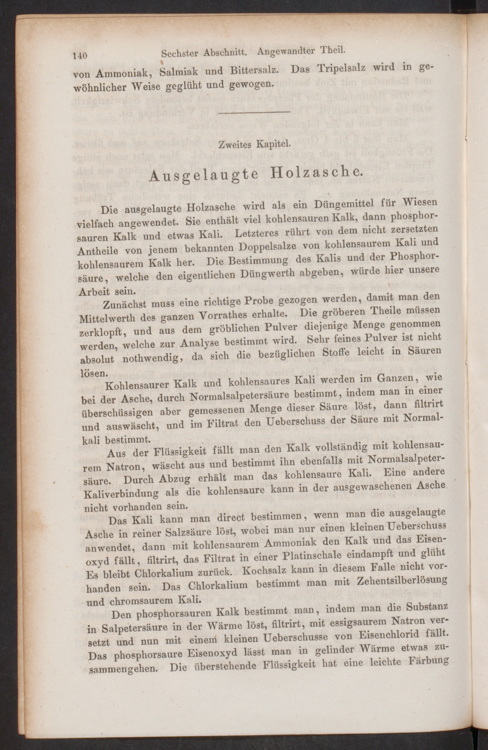 Die ausgelaugte Holzasche wird als ein Düngemittel für Wiesenvielfach angewendet. Sie enthält viel kohlensauren Kalk, dann phosphor-sauren Kalk und etwas Kali. Letzteres rührt von dem nicht zersetztenAntheile von jenem bekannten Doppelsalze von kohlensaurem Kali undkohlensaurem Kalk her. Die Bestimmung des Kalis und der Phosphor-säure, welche den eigentlichen Düngwerth abgeben, würde hier unsereArbeit sein.