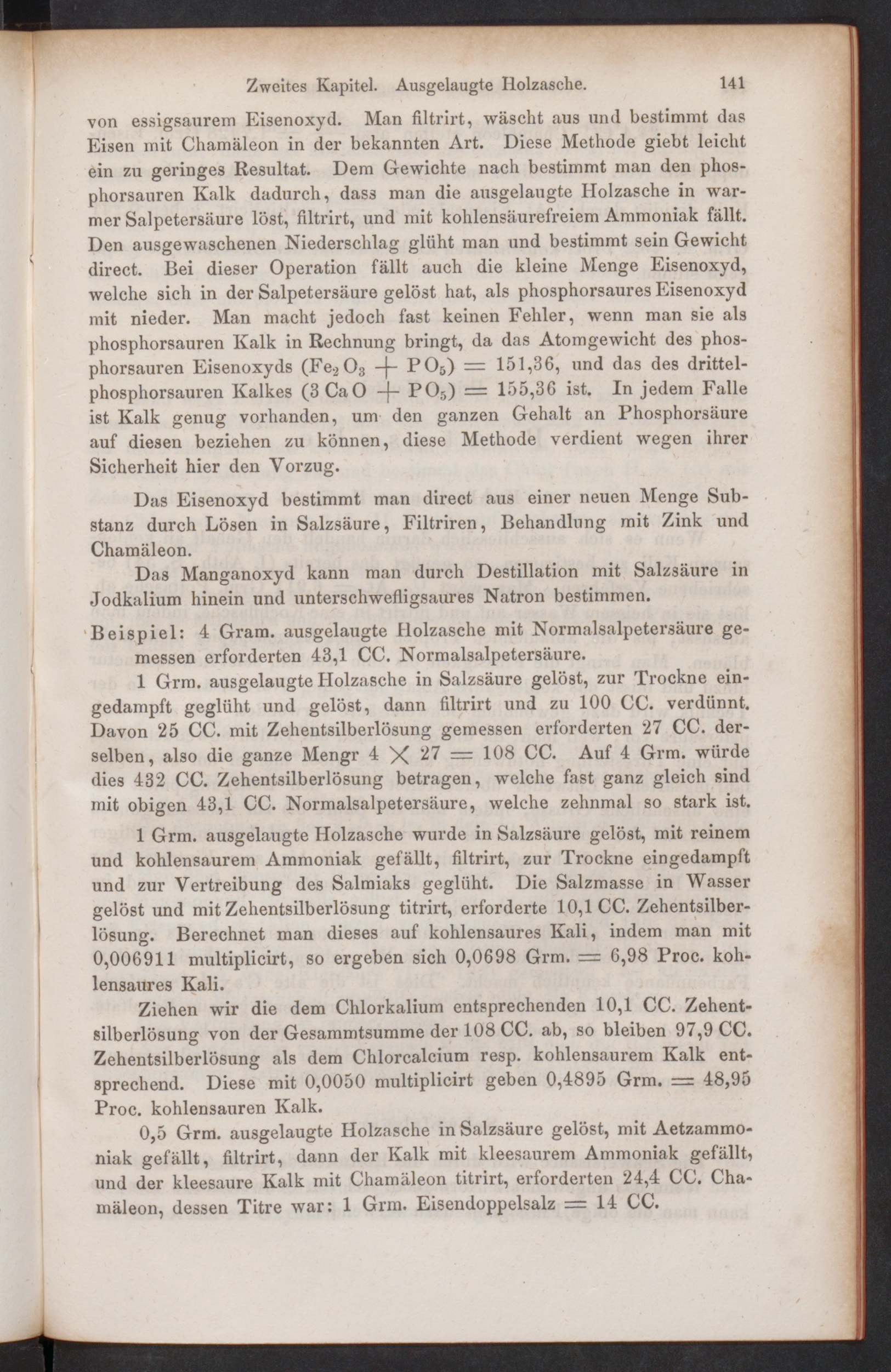 von essigsaurem Eisenoxyd. Man filtrirt, wäscht aus und bestimmt dasEisen mit Chamäleon in der bekannten Art. Diese Methode giebt leichtein zu geringes Resultat. Dem Gewichte nach bestimmt man den phos-phorsauren Kalk dadurch, dass man die ausgelaugte Holzasche in war-mer Salpetersäure löst, filtrirt, und mit kohlensäurefreiem Ammoniak fällt.Den ausgewaschenen Niederschlag glüht man und bestimmt sein Gewichtdirect. Bei dieser Operation fällt auch die kleine Menge Eisenoxyd,welche sich in der Salpetersäure gelöst hat, als phosphorsaures Eisenoxydmit nieder. Man macht jedoch fast keinen Fehler, wenn man sie alsphosphorsauren Kalk in Rechnung bringt, da das Atomgewicht des phos-phorsauren Eisenoxyds (Fe 2 0 3 -j- P0 5 ) = 151,36, und das des drittel-phosphorsauren Kalkes (3 CaO -j- P0 5 ) = 155,36 ist. In jedem Falleist Kalk genug vorhanden, um den ganzen Gehalt an Phosphorsäureauf diesen beziehen zu können, diese Methode verdient wegen ihrerSicherheit hier den Vorzug.