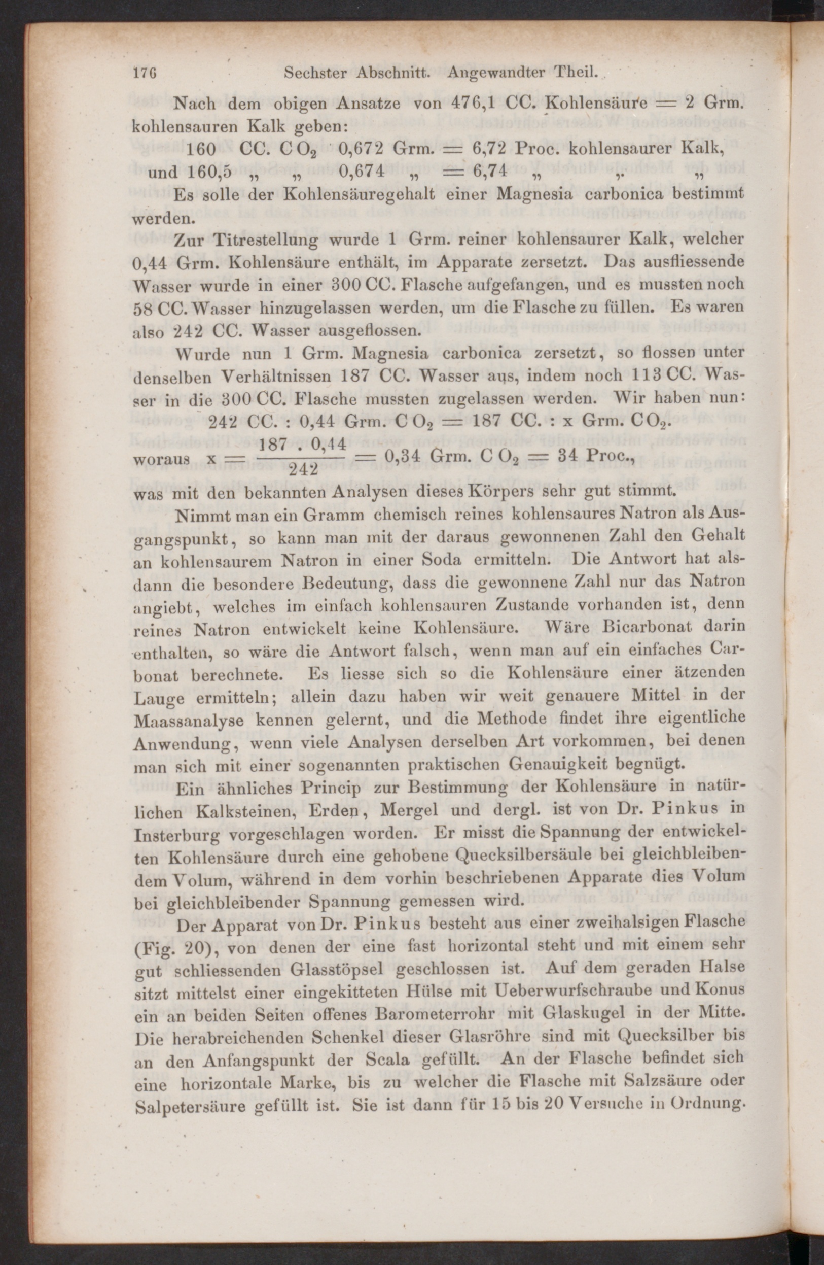 Wurde nun 1 Grm. Magnesia carbonica zersetzt, so flössen unterdenselben Verhältnissen 187 CC. Wasser aus, indem noch 113 CC. Was-ser in die 300 CC. Flasche mussten zugelassen werden. Wir haben nun: