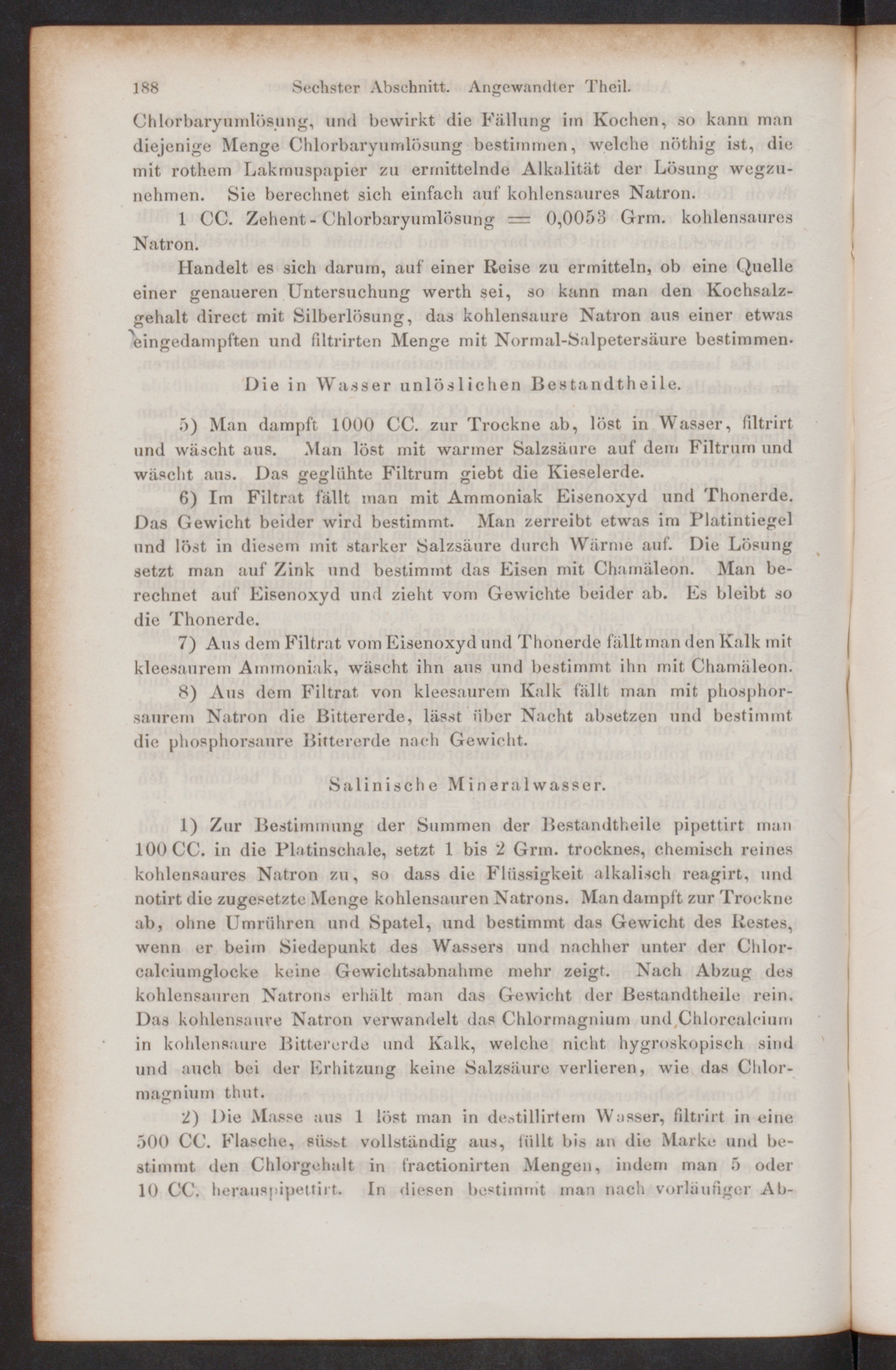 Handelt es sich darum, auf einer Reise zu ermitteln, ob eine Quelleeiner genaueren Untersuchung werth sei, so kann man den Kochsalz-gehalt direct mit Silberlösung, das kohlensaure Natron aus einer etwas'eingedampften und filtrirten Menge mit Normal-Salpetersäure bestimmen-