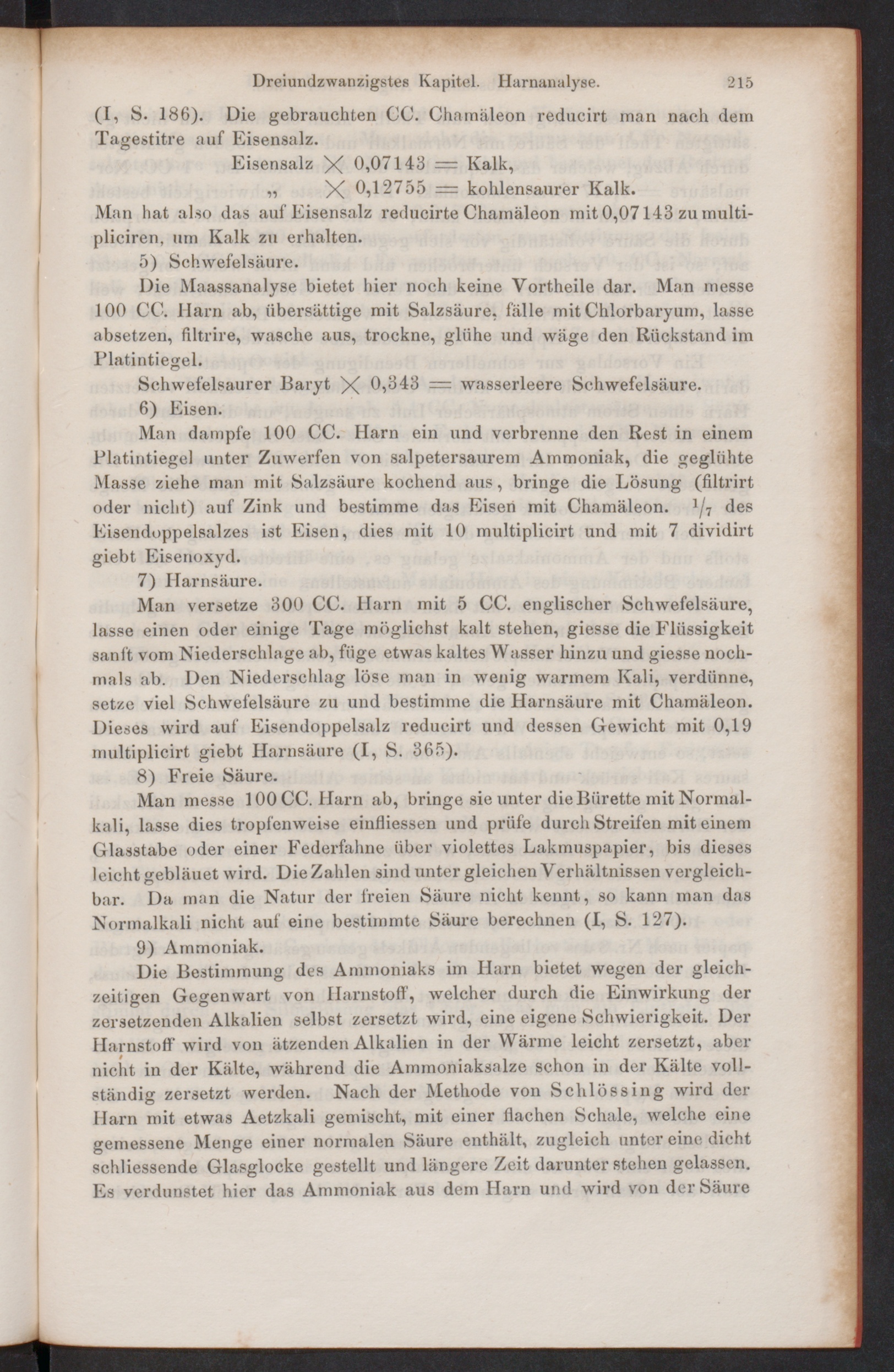 Man messe 100 CC. Harn ab, bringe sie unter die Bürette mit Normal-kali, lasse dies tropfenweise einfliessen und prüfe durch Streifen mit einemGlasstabe oder einer Federfahne über violettes Lakmuspapier, bis diesesleicht gebläuet wird. Die Zahlen sind unter gleichen Verhältnissen vergleich-bar. Da man die Natur der freien Säure nicht kennt, so kann man dasNormalkali nicht auf eine bestimmte Säure berechnen (I, S. 127).