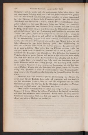 Essigsäure gelöst, worin sich die kohlensauren Salze leicht lösen. Ausder essigsauren Lösung wird das Zink mit Schwefelwasserstoff gefällt,und aus dem Filtrat vom Schwefelzink, nachdem es etwas eingedampftist, das Nickeloxyd durch freie Kleesäure gefällt. Da das kleesaureNickeloxyd mit kleesauren Alkalien lösliche Doppel Verbindungen einzu-gehen scheint, so hat man kleesaure Salze zur Fällung zu vermeiden.Im ersten Augenblicke, des Zusatzes der Kleesäure bemerkt man keineFällung, allein nach einiger Zeit trübt sich die Flüssigkeit und es setzt 'sichern hellgrünes Pulver ab. Erwärmung und Umschütteln befördern denAbsatz. Die grüne Farbe der Flüssigkeit wird immer heller, indem siean den Niederschlag Übertritt, und endlich ist die Flüssigkeit ganz farblos.Es ist zweckmässig, längere Zeit unter öfterem Uinschiitteln stehen zulassen. Die abfiltrirte Flüssigkeit ist ganz frei von Nickel, indem sie mitSchwefelammonium gar keine Färbung giebt. Der Niederschlag istdicht und lässt sich leicht durch ein Filtrum trennen. Im Aussüsswasser.ist er ganz unlöslich. Man spritzt ihn vom Filtrum herunter in ein Be-cherglas, setzt etwas Salzsäure zu, erwärmt bis zu 40° R. (50° C.) undbestimmt die Kleesäure mit Chamäleon. Die Cohäsion des kleesaurenNickeloxyds ist so gross, dass es sich selbst in Mineralsäuren sehr weniglöst, und dass deshalb auch das Chamäleon nur allmälig auf die Klee-säure wirken kann, wie nämlich das Salz nach der Zerstörung der ge-lösten Kleesäure selbst zur Lösung gelangt. Die Titrirung der Kleesäureim kleesauren Nickeloxyd geht entschieden langsamer, als die des klee-sauren Kalkes. Maste fand die Resultate sehr genau, indem der Nieder-schlag von gleichem Volum Normalkleesäure- und Normalnickellö-sung eben so viel Chamäleon erforderte, als die Normalkleesäure für sichallein.