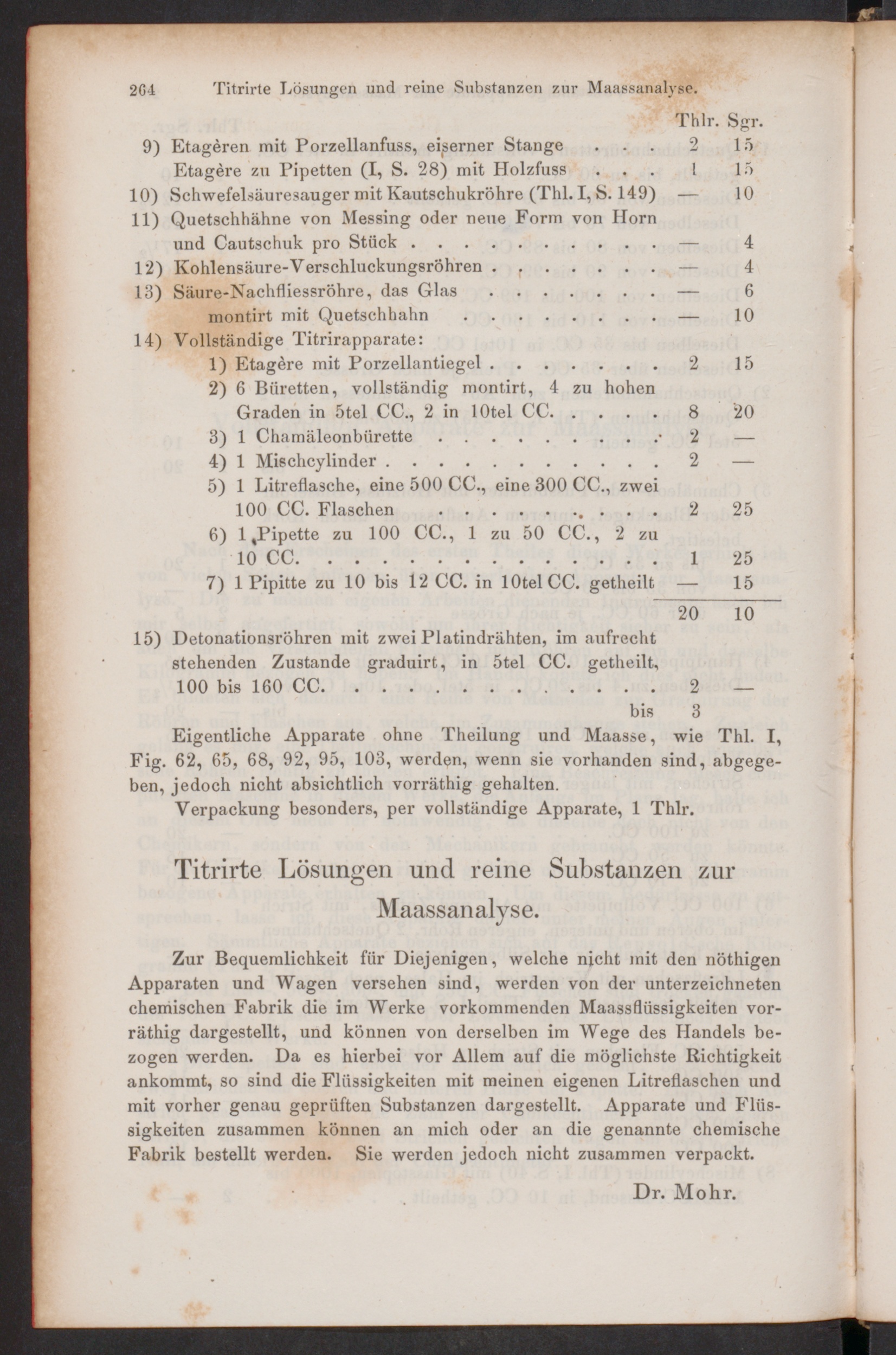 264 Titrirte Lösungen und reine Substanzen zur Maassanalyse.