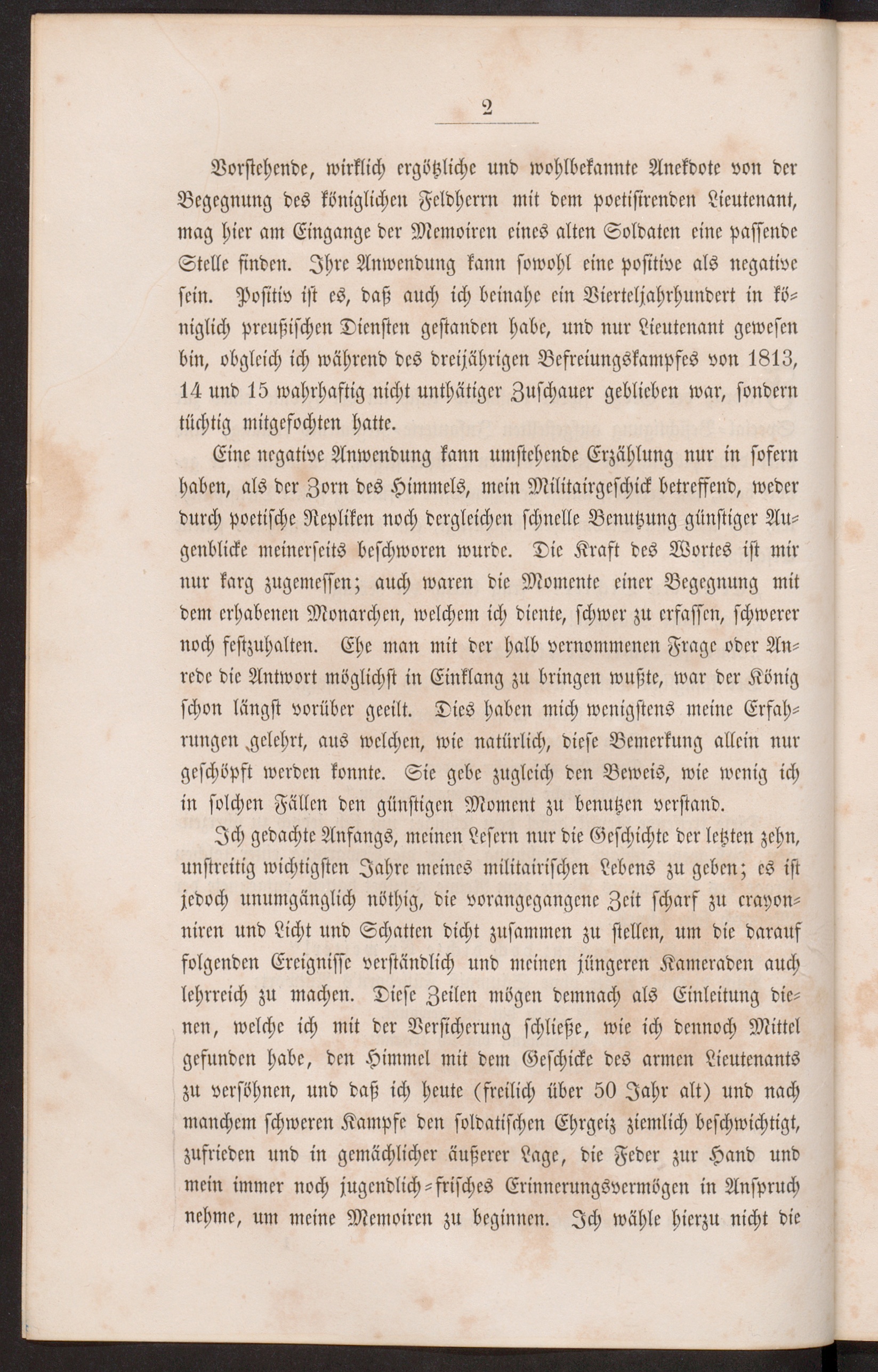 Vorstehende, wirklich ergötzliche und wohlbekannte Anekdote von derBegegnung des königlichen Feldherrn mit dem poetisirenden Lieutenant,mag hier am Eingänge der Memoiren eines alten Soldaten eine passendeStelle finden. Ihre Anwendung kann sowohl eine positive als negativesein. Positiv ist es, daß auch ich beinahe ein Vierteljahrhundert in kö-niglich preußischen Diensten gestanden habe, und nur Lieutenant gewesenbin, obgleich ich während des dreijährigen Befreiungskampfes von 1813,14 und 15 wahrhaftig nicht unthätiger Zuschauer geblieben war, sonderntüchtig mitgefochten hatte.