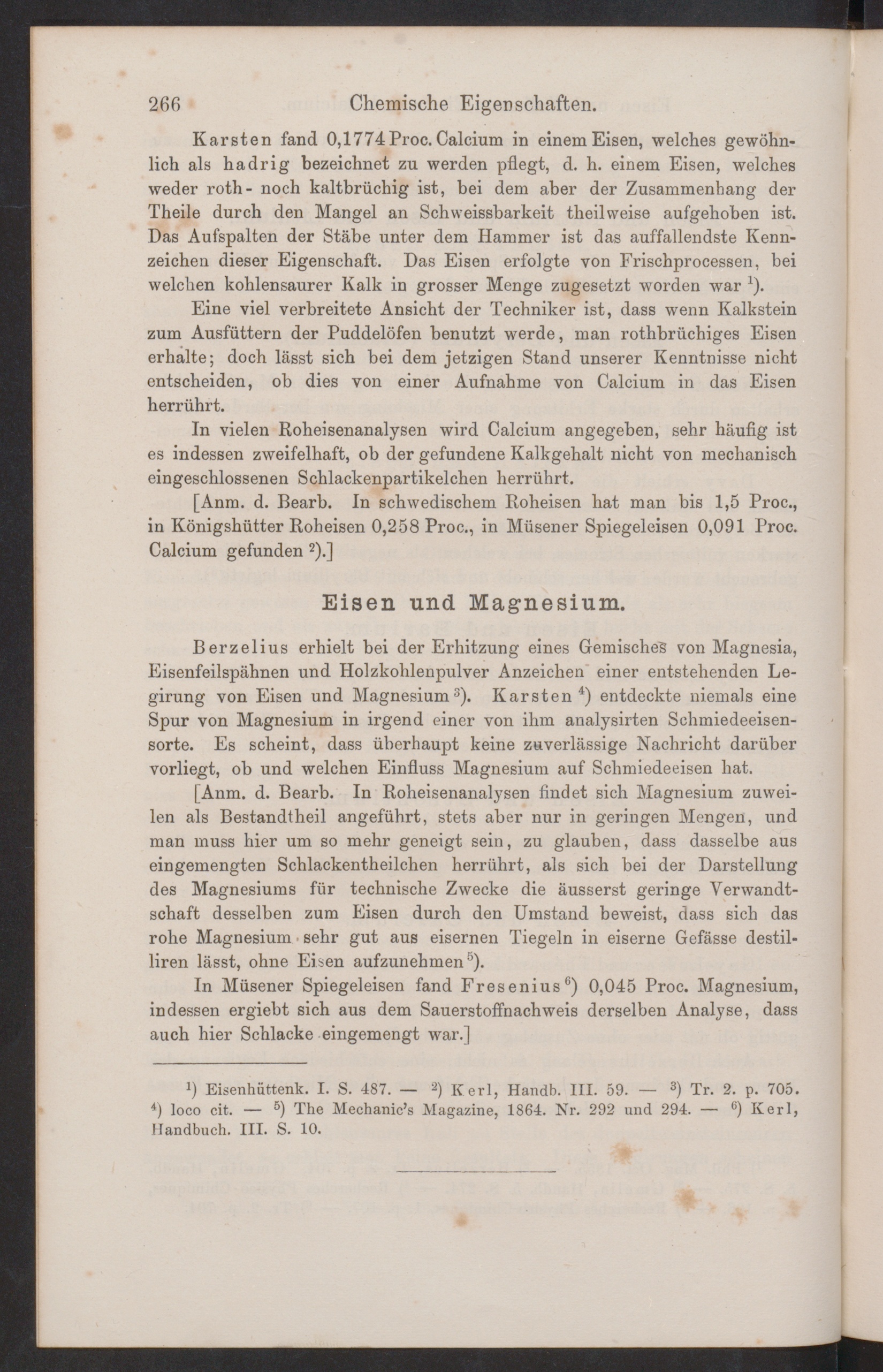 [Anm. d. Bearb. In Roheisenanalysen findet sich Magnesium zuwei-len als Bestandtheil angeführt, stets aber nur in geringen Mengen, undman muss hier um so mehr geneigt sein, zu glauben, dass dasselbe auseingemengten Schlackentheilchen herrührt, als sich bei der Darstellungdes Magnesiums für technische Zwecke die äusserst geringe Verwandt-schaft desselben zum Eisen durch den Umstand beweist, dass sich dasrohe Magnesium ■ sehr gut aus eisernen Tiegeln in eiserne Gefässe destil-liren lässt, ohne Eisen aufzunehmen 6 ).