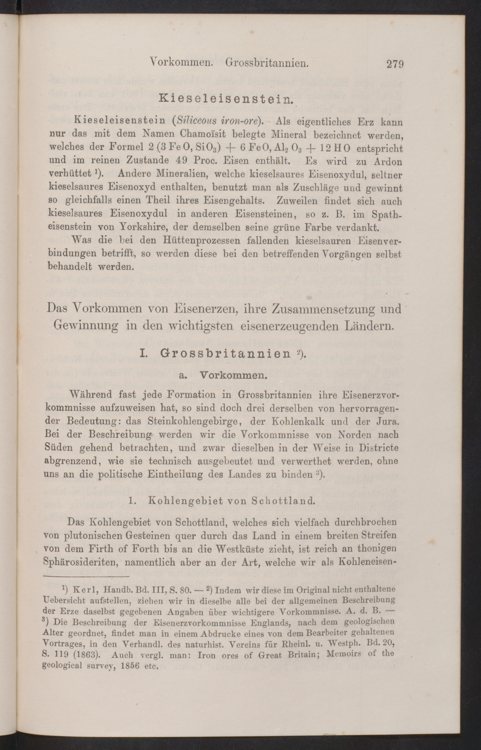 Das Kohlengebiet von Schottland, welches sich vielfach durchbrochenvon plutonischen Gesteinen quer durch das Land in einem breiten Streifenvon dem Firth of Forth bis an die Westküste zieht, ist reich an thonigenSphärosideriten, namentlich aber an der Art, welche wir als Kohleneisen-