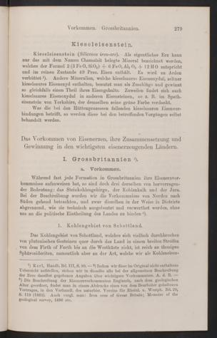 Während fast jede Formation in Grossbritannien ihre Eisenerzvor-kommnisse aufzuweisen hat, so sind doch drei derselben von hervorragen-der Bedeutung: das Steinkohlengebirge, der Kohlenkalk und der Jura.Bei der Beschreibung werden wir die Vorkommnisse von Norden nachSüden gehend betrachten, und zwar dieselben in der Weise in Districteabgrenzend, wie sie technisch ausgebeutet und verwerthet werden, ohneuns an die politische Eintheilung des Landes zu binden 3 ).