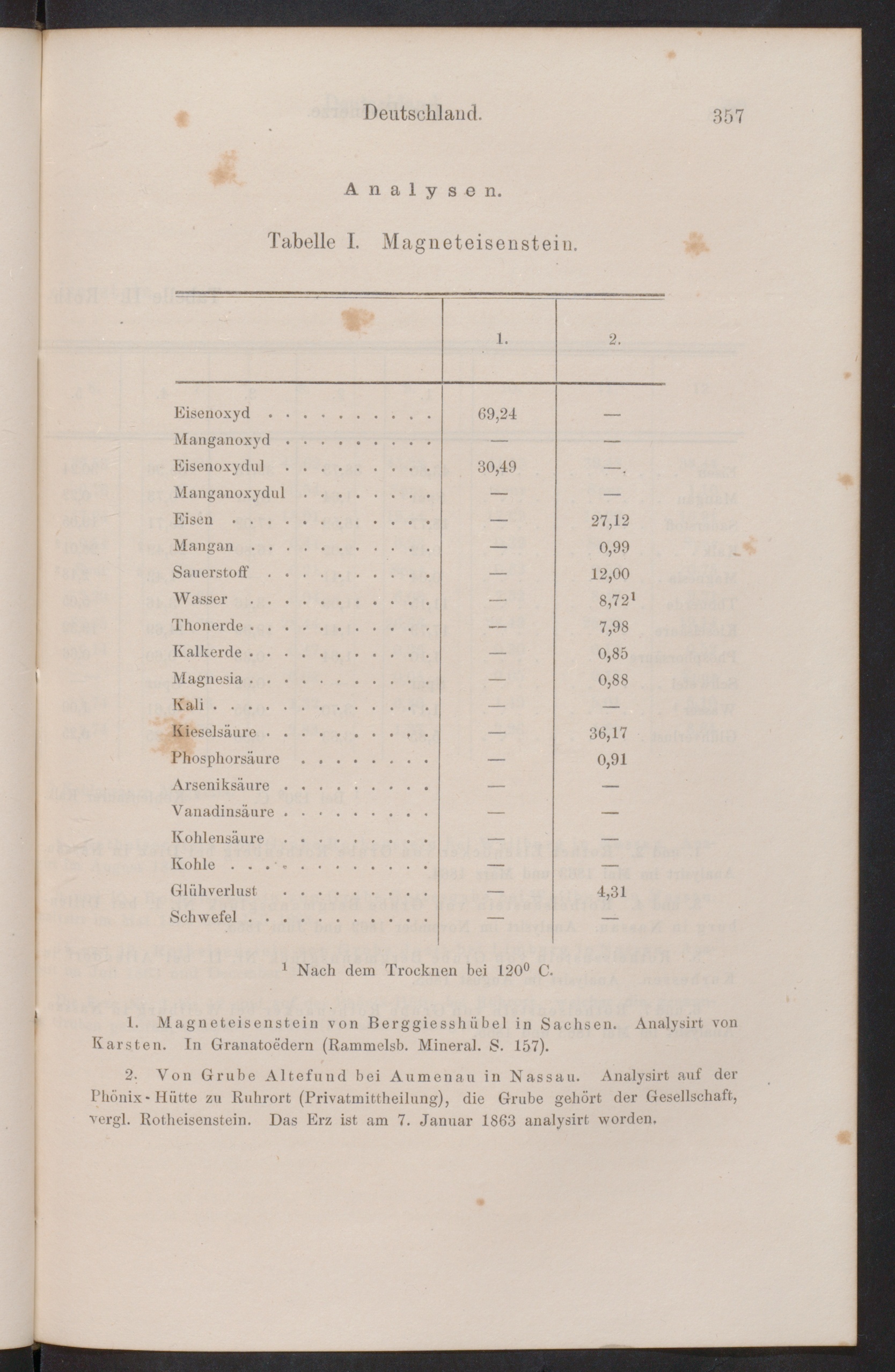 1. Magneteisenstein von Berggiesshübel in Sachsen. Analysirt vonKarsten. In Granatoedern (Rammelsb. Mineral. S. 157).