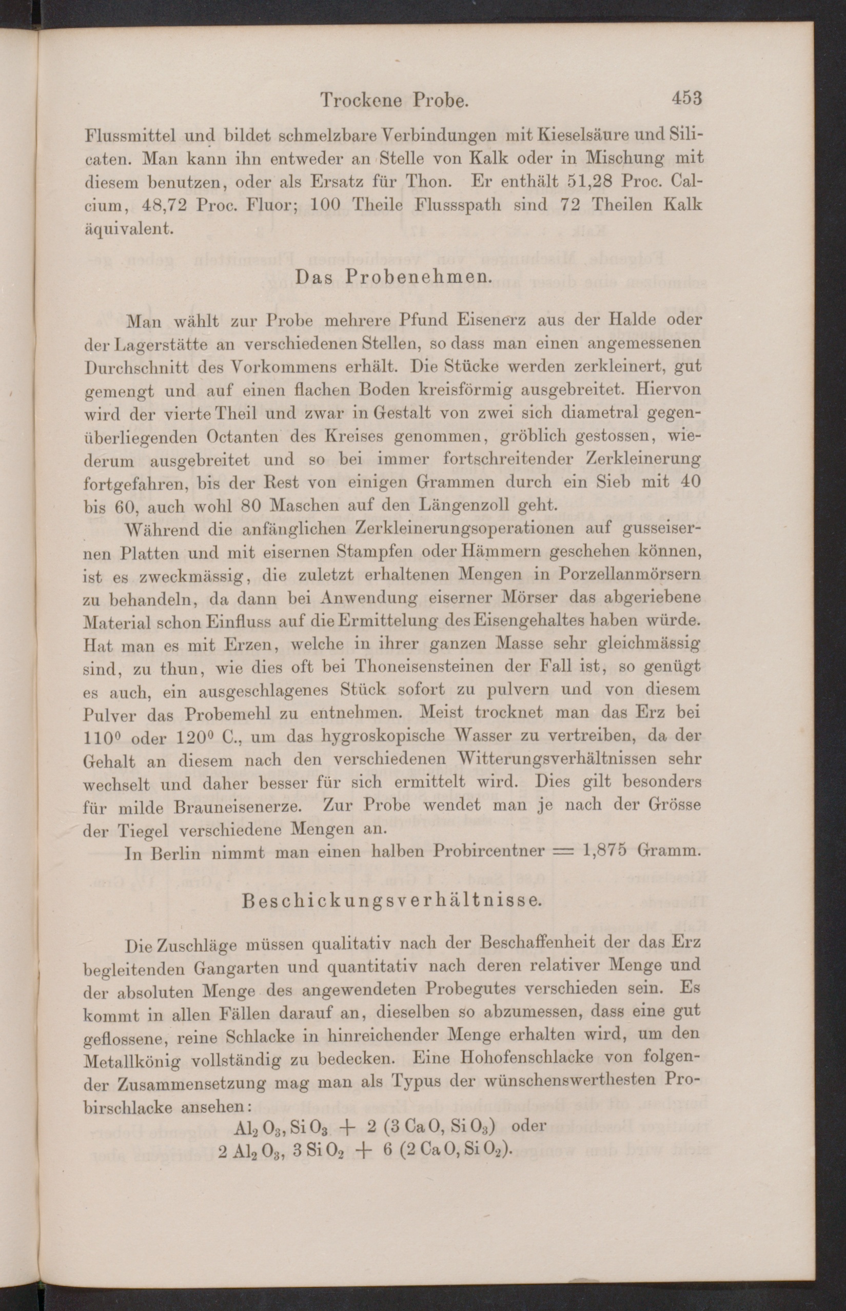 Die Zuschläge müssen qualitativ nach der Beschaffenheit der das Erzbegleitenden Gangarten und quantitativ nach deren relativer Menge undder absoluten Menge des angewendeten Probegutes verschieden sein. Eskommt in allen Fällen darauf an, dieselben so abzumessen, dass eine gutgeflossene, reine Schlacke in hinreichender Menge erhalten wird, um denMetallkönig vollständig zu bedecken. Eine Hohofenschlacke von folgen-der Zusammensetzung mag man als Typus der wünschenswerthesten Pro-birschlacke ansehen:
