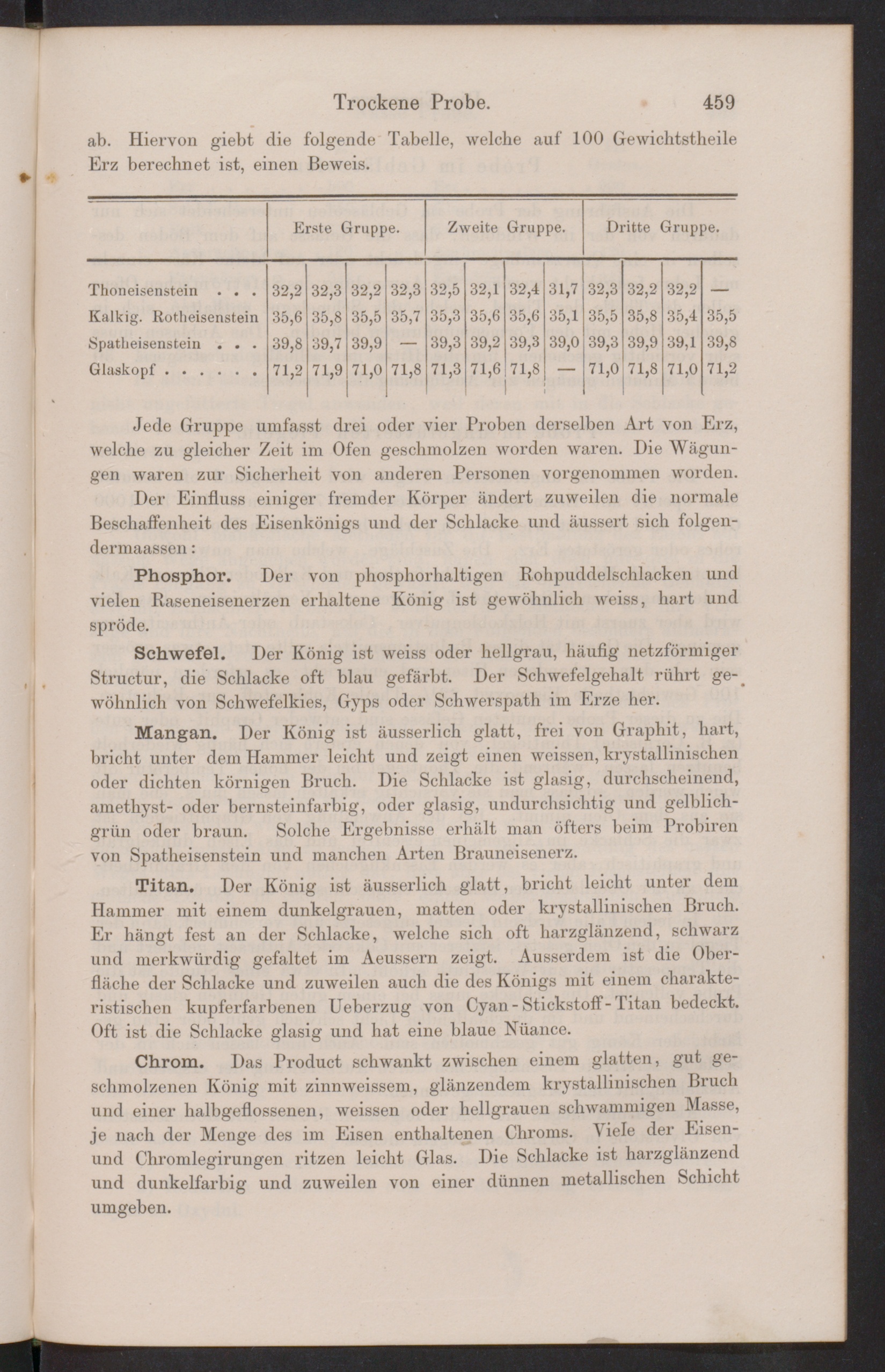 Mangan. Der König ist äusserlich glatt, frei von Graphit, hart,bricht unter dem Hammer leicht und zeigt einen weissen, krystallinischenoder dichten körnigen Bruch. Die Schlacke ist glasig, durchscheinend,amethyst- oder bernsteinfarbig, oder glasig, undurchsichtig und gelblich-grün oder braun. Solche Ergebnisse erhält man öfters beim Probirenvon Spatheisenstein und manchen Arten Brauneisenerz.
