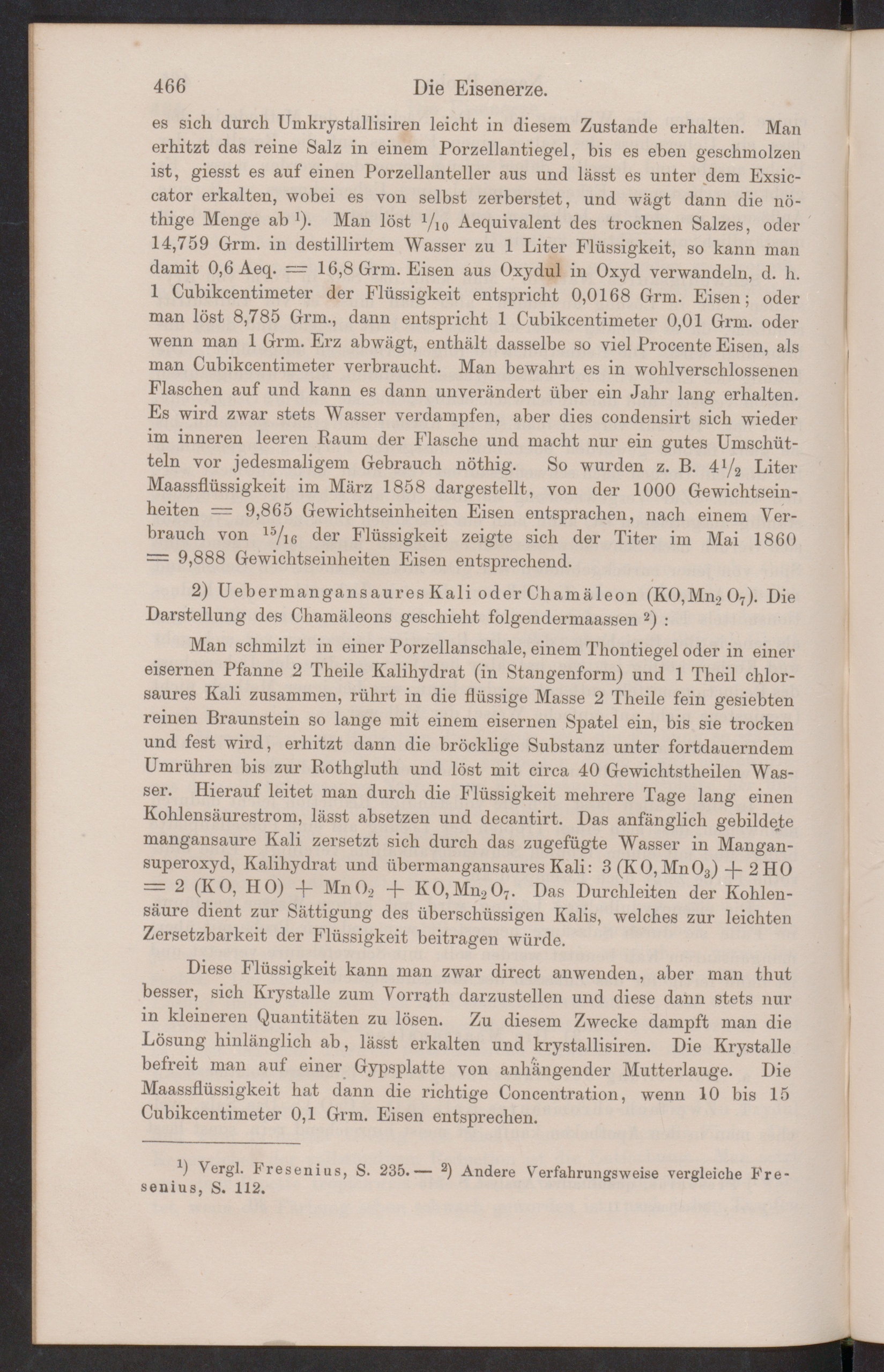 es sich durch Umkrystallisiren leicht in diesem Zustande erhalten. Manerhitzt das reine Salz in einem Porzellantiegel, bis es eben geschmolzenist, giesst es auf einen Porzellanteller aus und lässt es unter dem Exsic-cator erkalten, wobei es von selbst zerberstet, und wägt dann die nö-thige Menge ab 1 )- Man löst Vio Aequivalent des trocknen Salzes, oder14,759 Grm. in destillirtem Wasser zu 1 Liter Flüssigkeit, so kann mandamit 0,6 Aeq. — 16,8 Grm. Eisen aus Oxydul in Oxyd verwandeln, d. h.1 Cubikcentimeter der Flüssigkeit entspricht 0,0168 Grm. Eisen; oderman löst 8,785 Grm., dann entspricht 1 Cubikcentimeter 0,01 Grm. oderwenn man 1 Grm. Erz abwägt, enthält dasselbe so viel Procente Eisen, alsman Cubikcentimeter verbraucht. Man bewahrt es in wohlverschlosseneuFlaschen auf und kann es dann unverändert über ein Jahr lang erhalten.Es wird zwar stets Wasser verdampfen, aber dies condensirt sich wiederim inneren leeren Raum der Flasche und macht nur ein gutes Umschüt-teln vor jedesmaligem Gebrauch nöthig. So wurden z. B. 4 l / 2 LiterMaassflüssigkeit im März 1858 dargestellt, von der 1000 Gewichtsein-heiten = 9,865 Gewichtseinheiten Eisen entsprachen, nach einem Ver-brauch von 15 /l6 der Flüssigkeit zeigte sich der Titer im Mai 1860= 9,888 Gewichtseinheiten Eisen entsprechend.