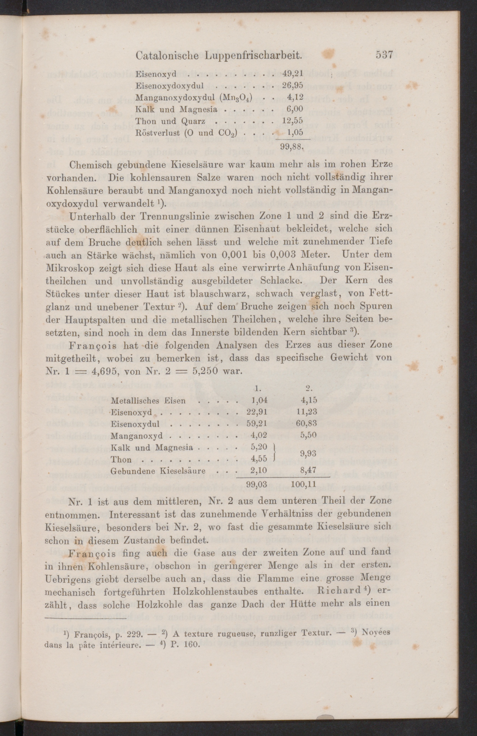 Frangois hat die folgenden Analysen des Erzes aus dieser Zonemitgetheilt, wobei zu bemerken ist, dass das specifische Gewicht vonNr. 1 = 4,695, von Nr. 2 = 5,250 war.