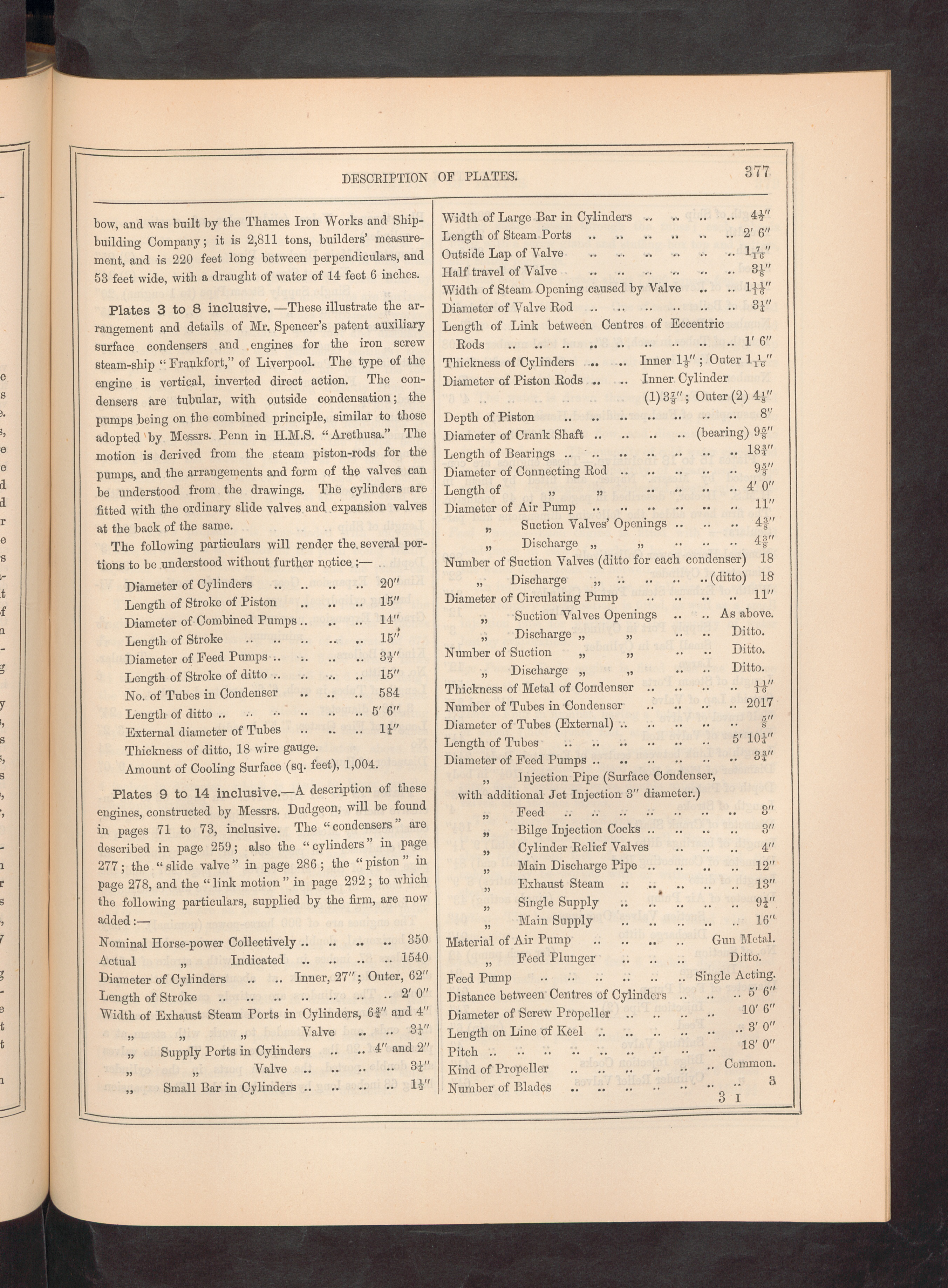 Plates 3 to 8 inclusive. —These illustrate the ar-rangement and details of Mr. Spencer’s patent auxiliarysurface condensers and engines for the iron screwsteam-ship “ Frankfort,” of Liverpool. The type of theengine is vortical, inverted direct action. The con-densers are tubular, with outside condensation; thepumps being on the combined principle, similar to thoseadopted by Messrs. Penn in H.M.S. “ Aretliusa.” Themotion is derived from the steam piston-rods for thepumps, and the arrangements and form of the valves canbo understood from the drawings. The cylinders ar6fitted with the ordinary slide valves and expansion valvesat the back of the same.