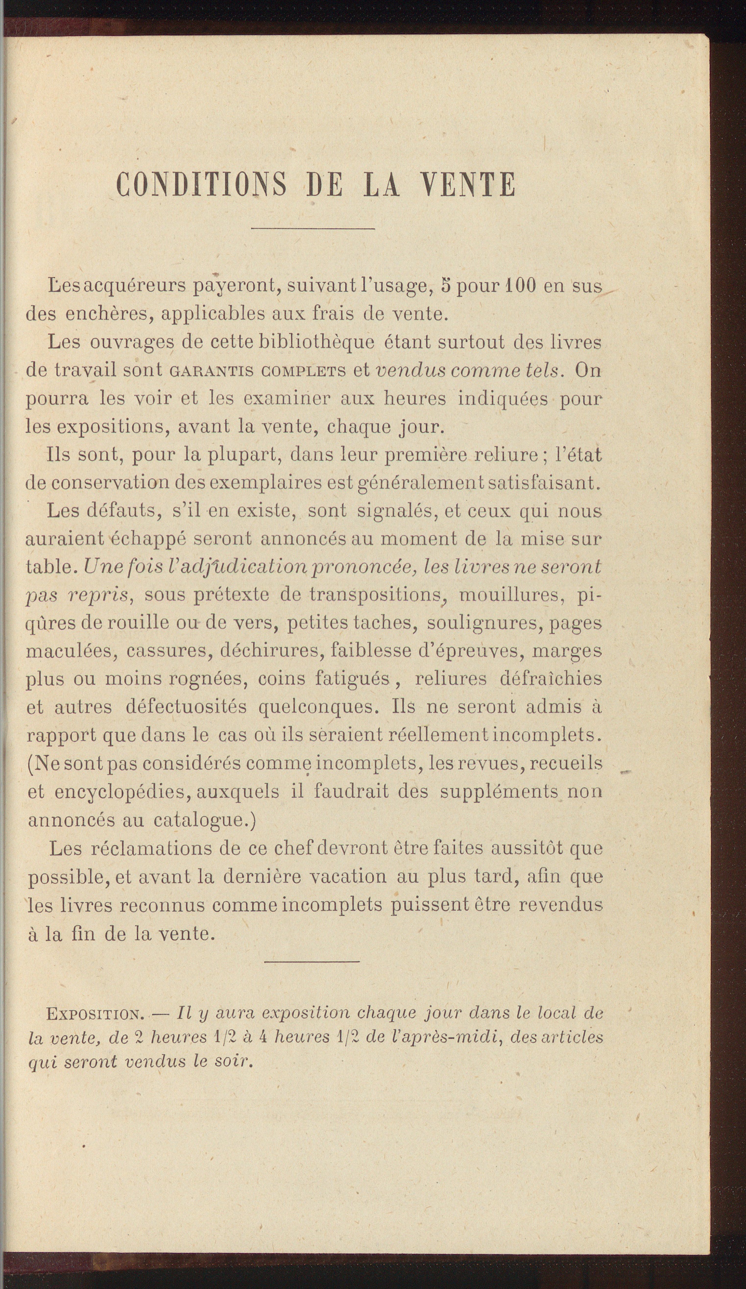 Les ouvrages de cette bibliothèque étant surtout des livresde travail sont garantis complets et vendus comme tels. Onpourra les voir et les examiner aux heures indiquées pourles expositions, avant la vente, chaque jour.