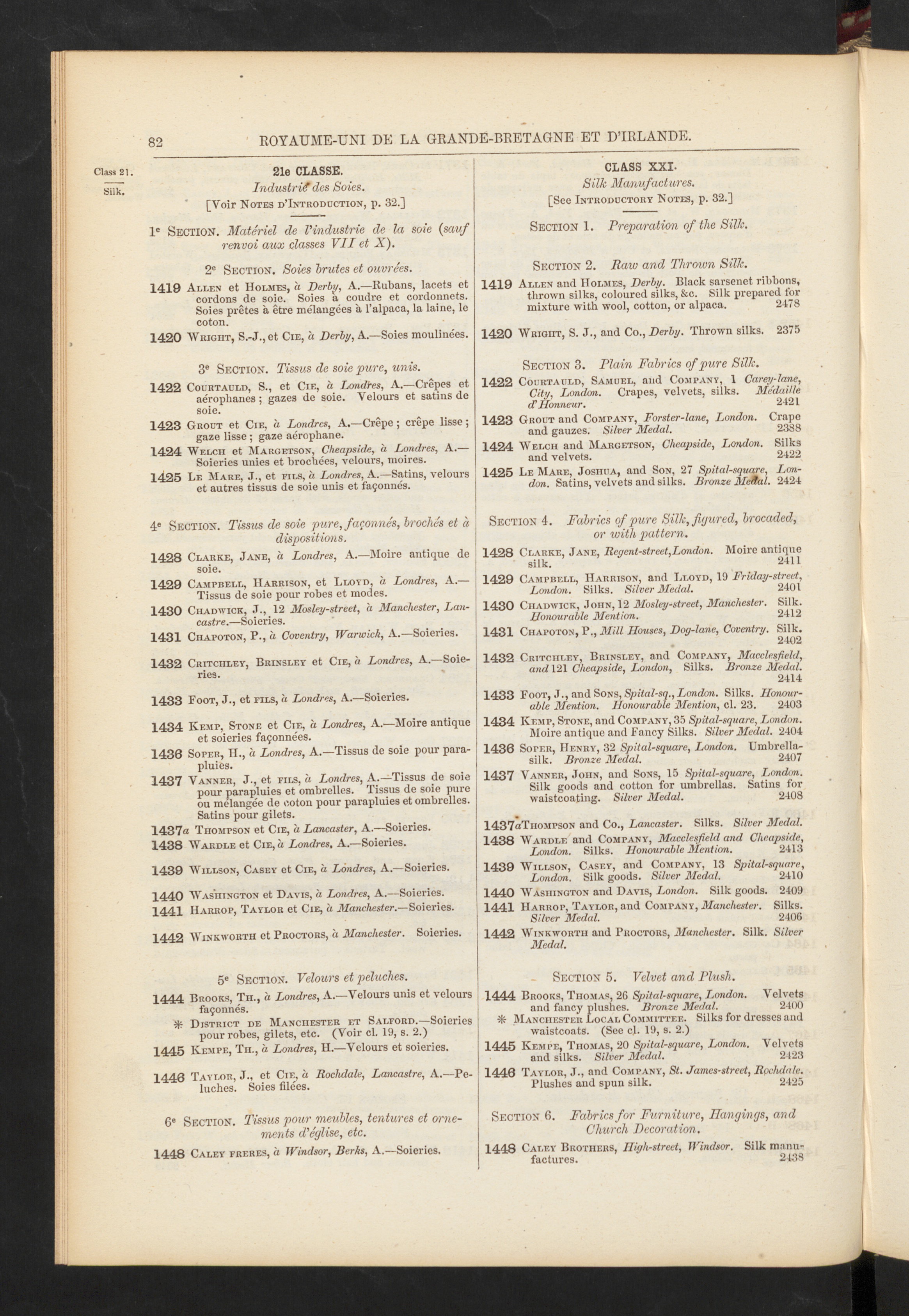 1 1432 Crttciilev, Brinsley, and Company, Macclesfield,I and 121 Cheapside, London, Silks. Bronze Medal.